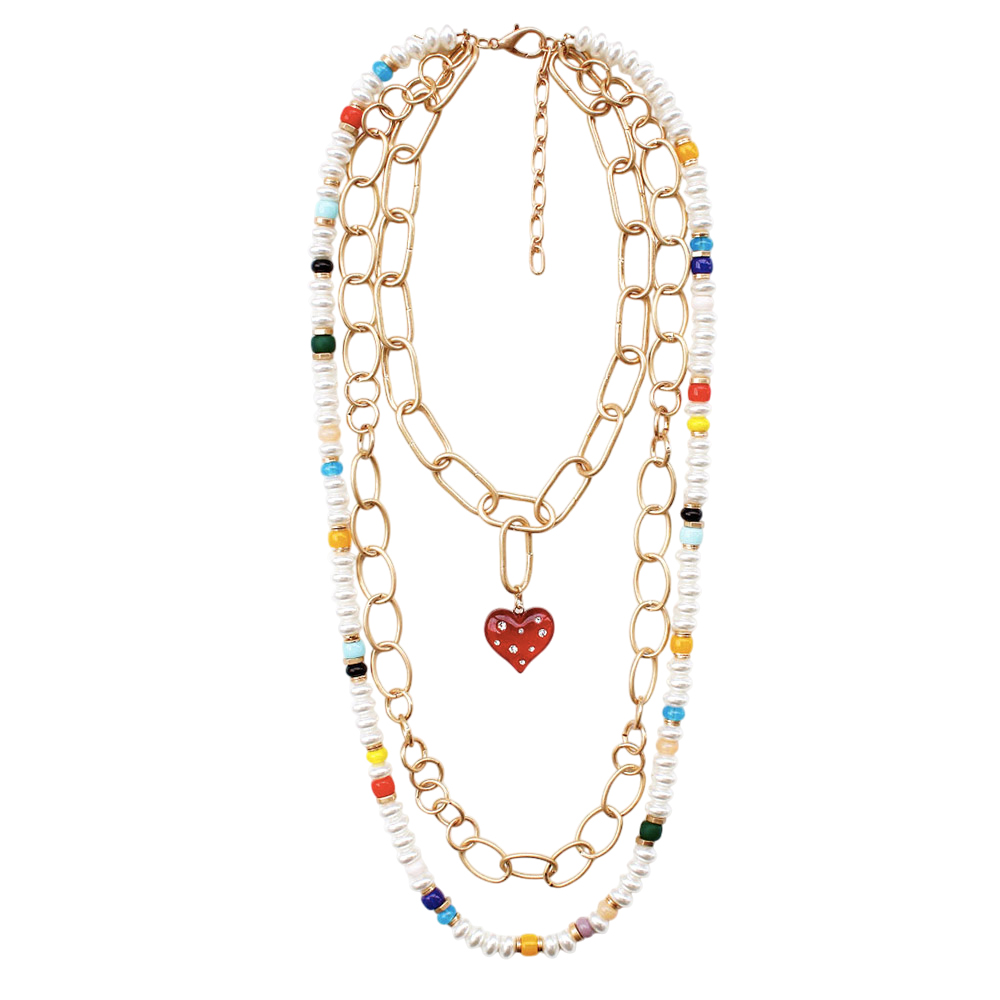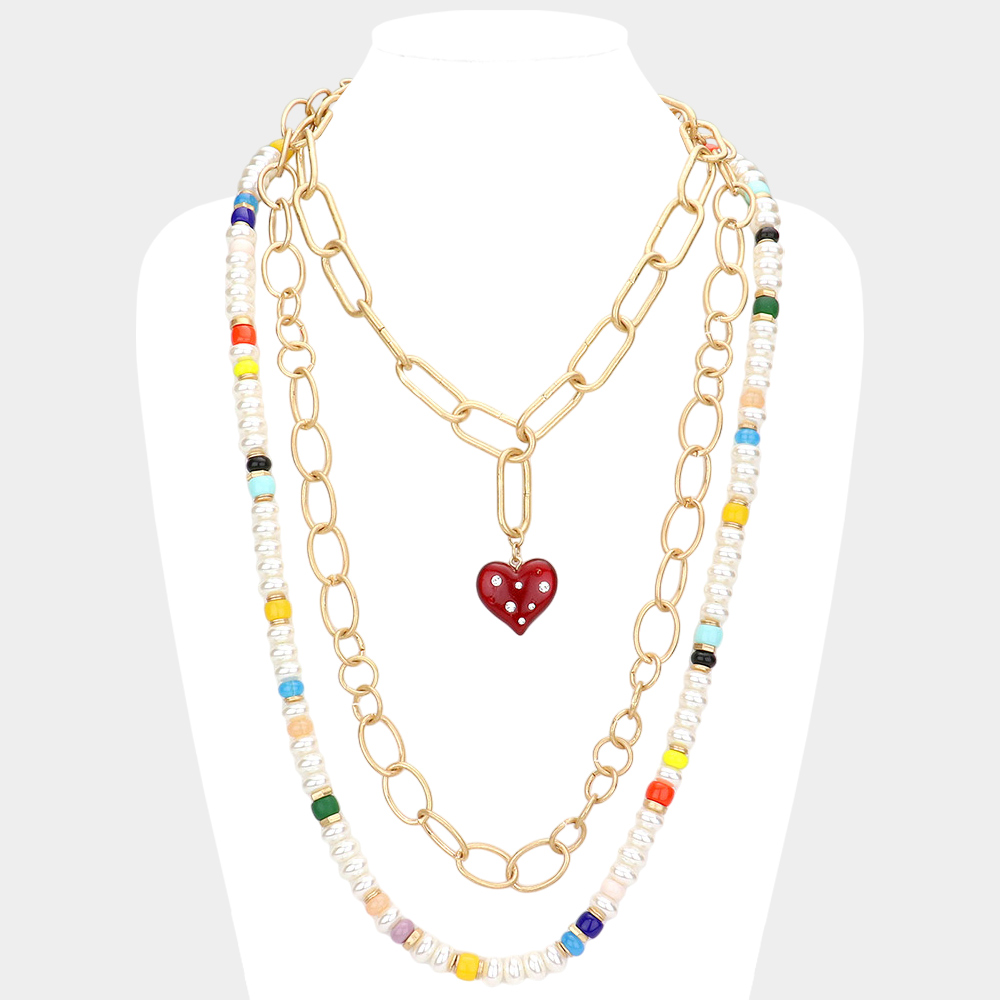 Heart Pendant Accented Pearl Resin Beaded Triple Layered Necklace