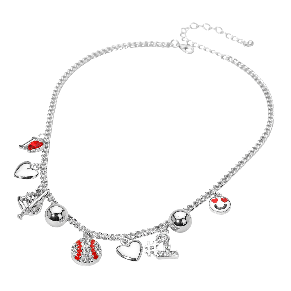 Details • Necklace Size : 16" + 3" L • Decor Size : 1" L • Add fun and personality to your look with this playful charm necklace featuring heart, emoji, and trophy pendants. Designed to capture a youthful spirit, it’s a versatile accessory that blends sparkle and charm, making it perfect for everyday wear or as a cheerful gift. • Lead and Nickel Compliant