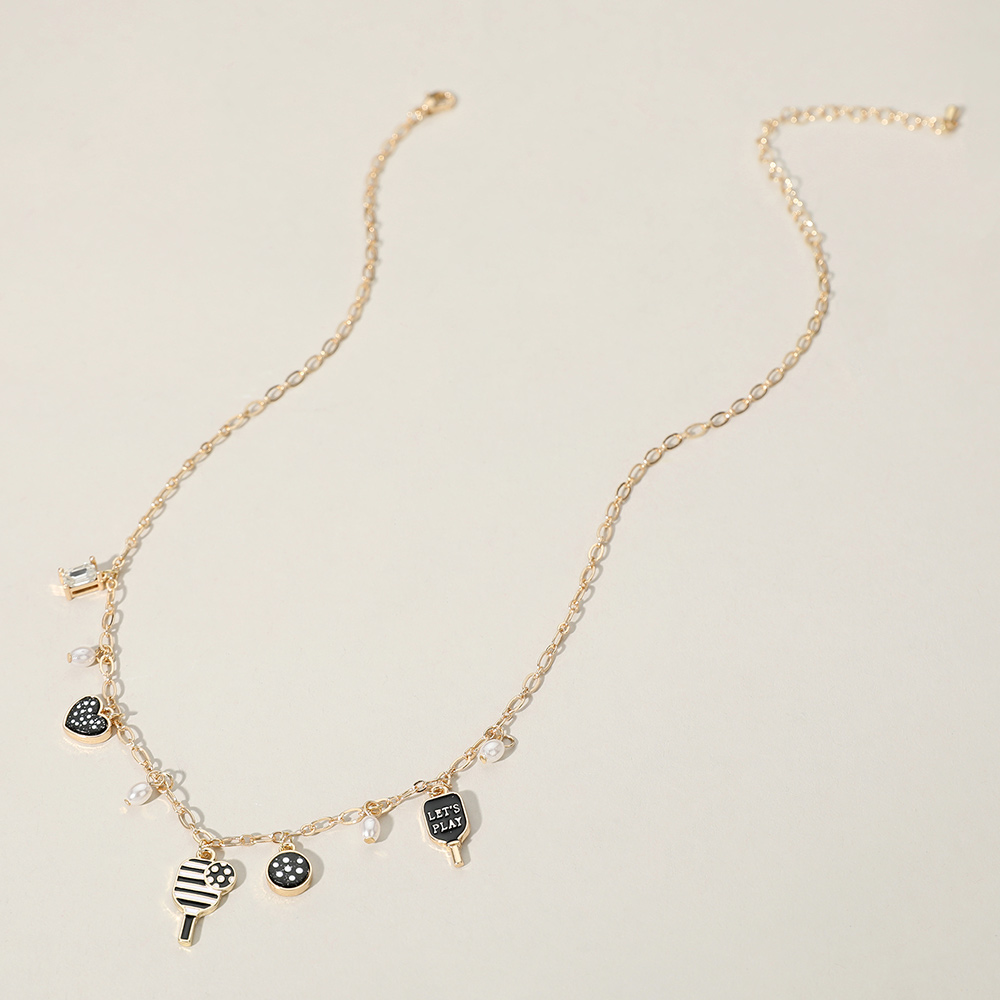 • Whimsical charm necklace featuring fun pickleball-themed pendants and delicate details. A light chain displays heart, ball, paddle, and other sporty icons. Perfect for casual wear or gifting fans.