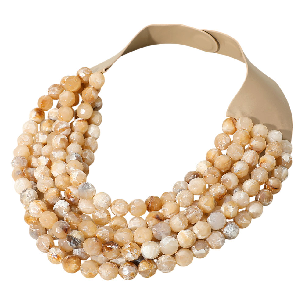 Details • Necklace Size : 18" + 1.75" L • Decor Size : 2.5" L • Magnetic Closure • Make a statement with this layered beaded necklace featuring multiple strands of faceted round beads and a wide neck band. Perfect for adding a bold, artistic touch to any outfit. • Lead and Nickel Compliant