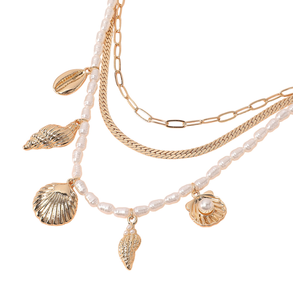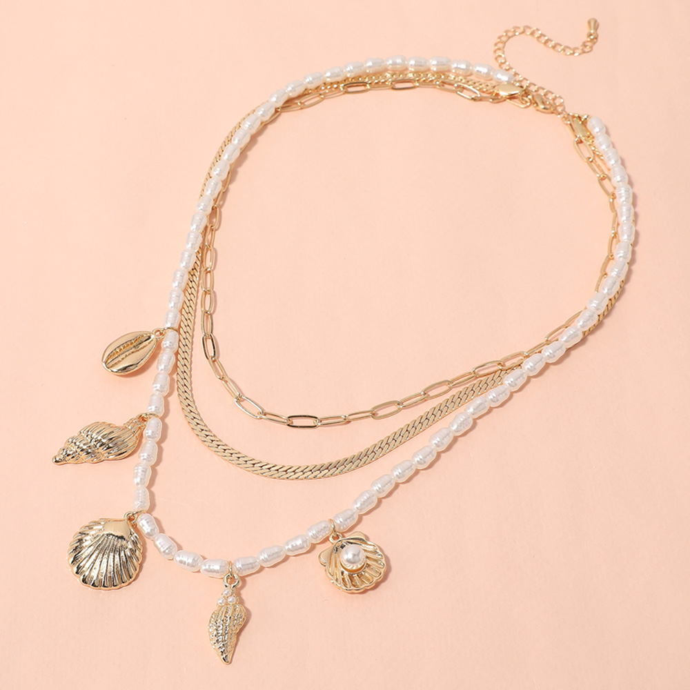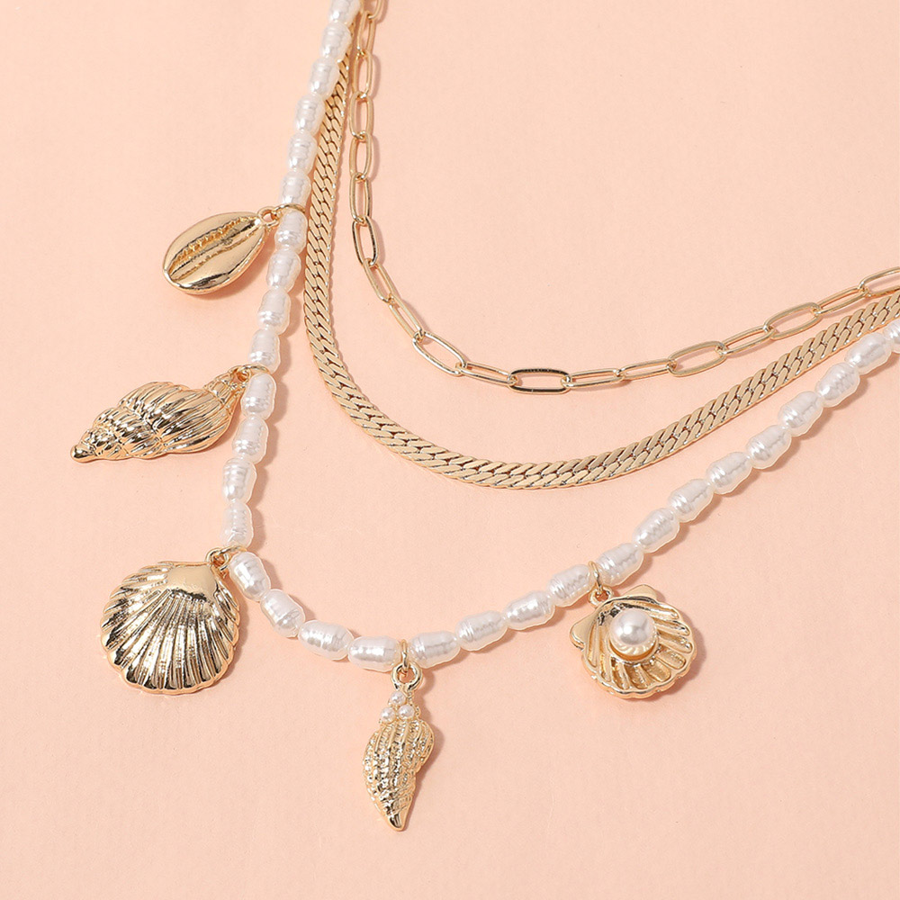 Metal Seashell Puka Shell Charm Station Pearl Herringbone Paperclip Chain Layered Necklace