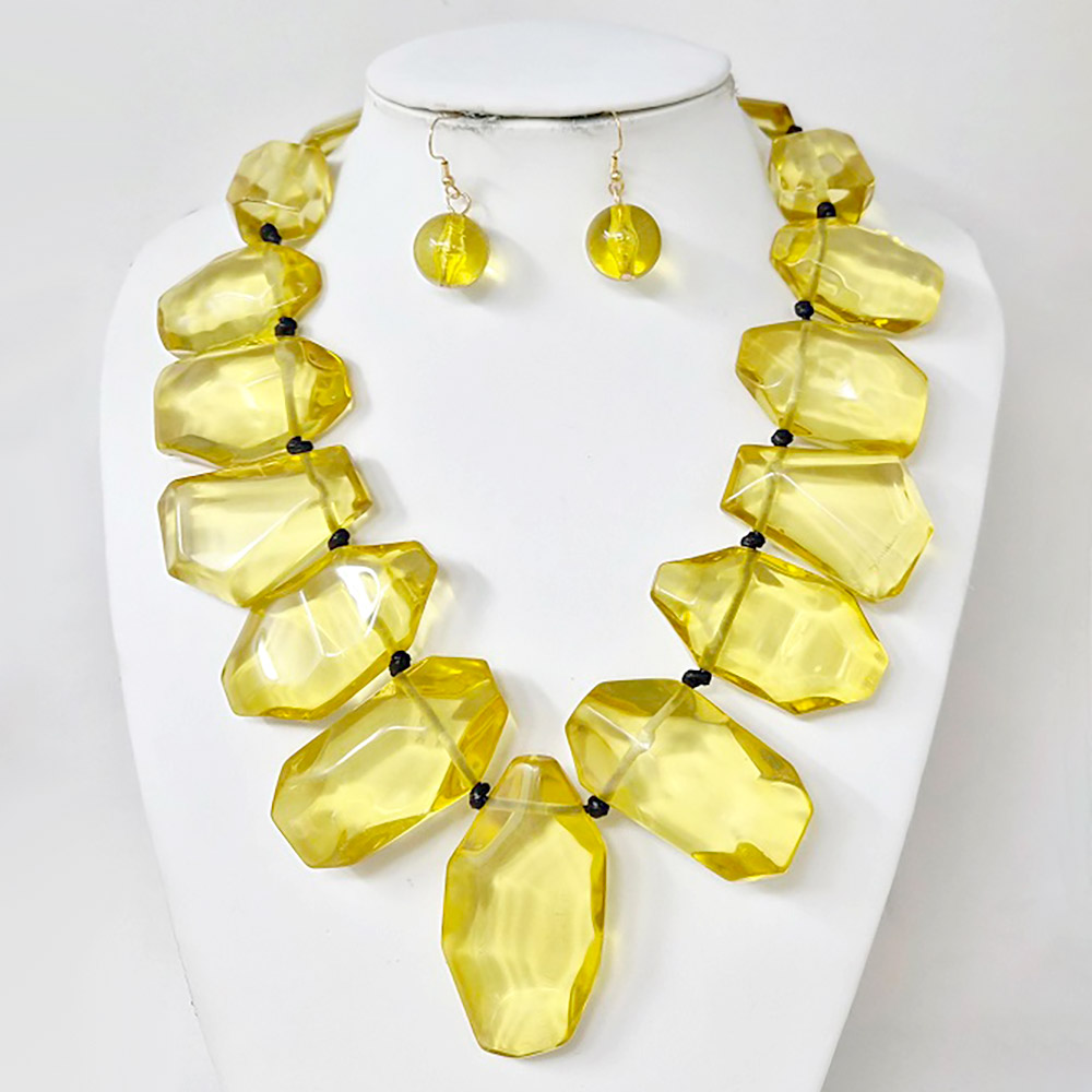 Details • Necklace Size : 21.5" + 2.5" L • Decor Size : 2.5" L • Earrings Size : 1.75" L • Bold faceted necklace and matching earrings set with oversized geometric beads. This eye-catching duo is perfect for adding drama to evening looks or elevating any outfit with striking, sculptural style. • Lead and Nickel Compliant
