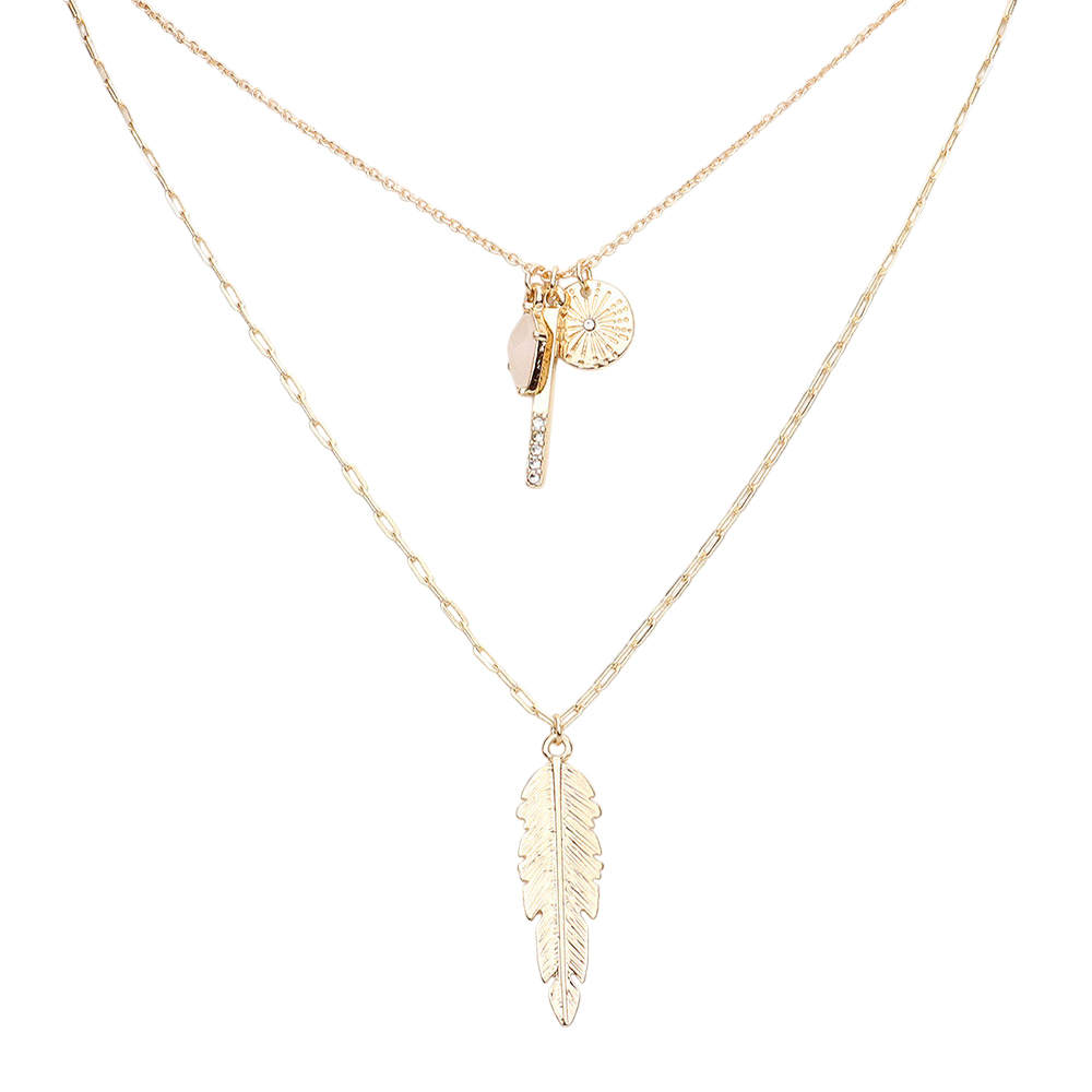 Natural Stone Rhinestone Metal Bar Feather Pendant Double Layered Necklace