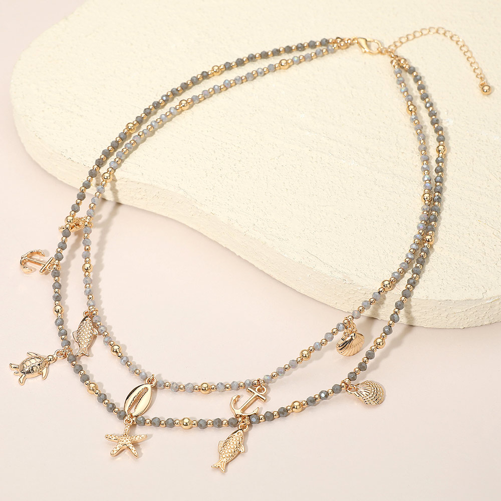 Details • Necklace Size : 16.5" + 3" L • Decor Size : 2" L • This layered beaded necklace features charming ocean-inspired pendants including seashells, fish, and anchors. A stylish accessory that brings a touch of coastal elegance to your look, perfect for adding playful detail to everyday or vacation outfits. • Lead and Nickel Compliant
