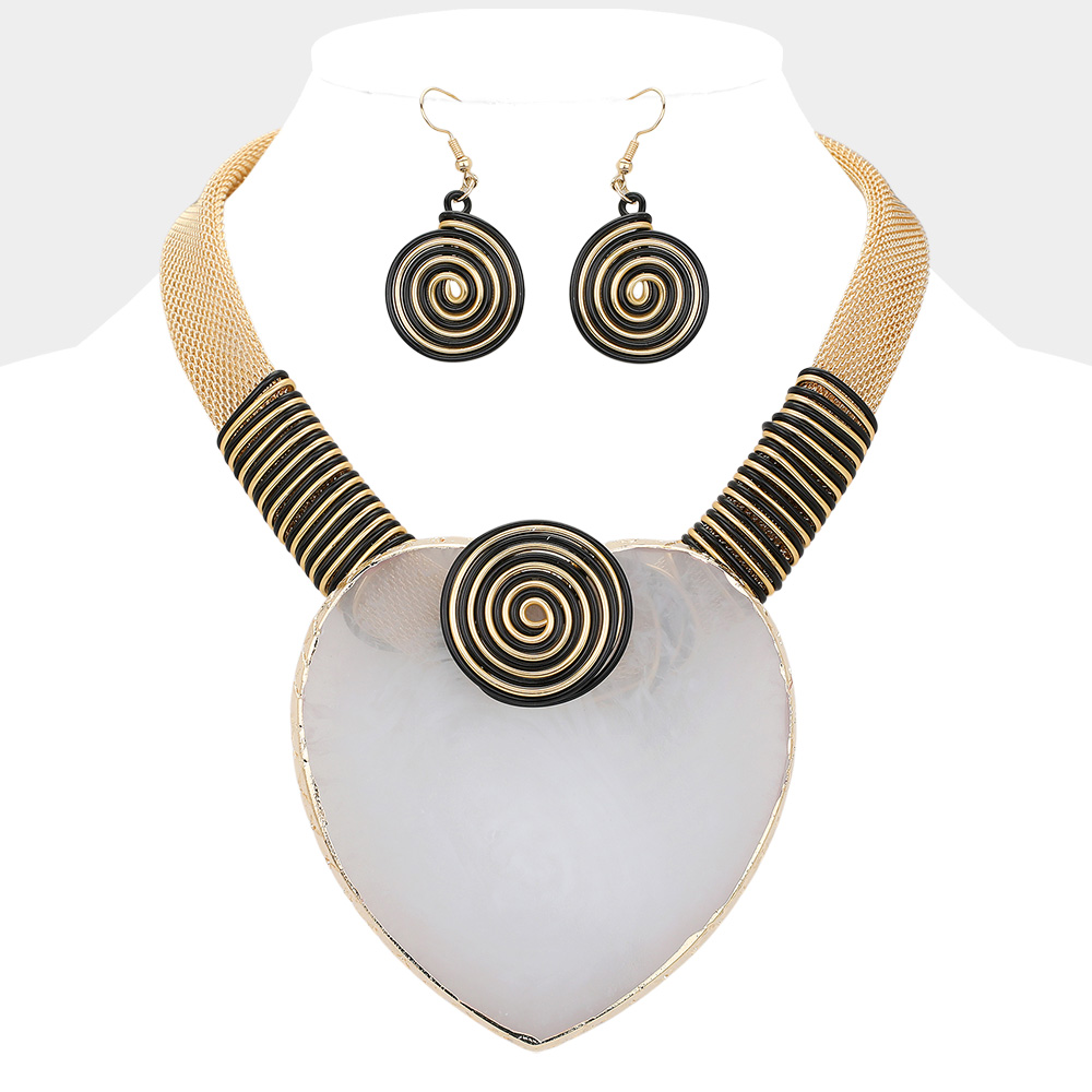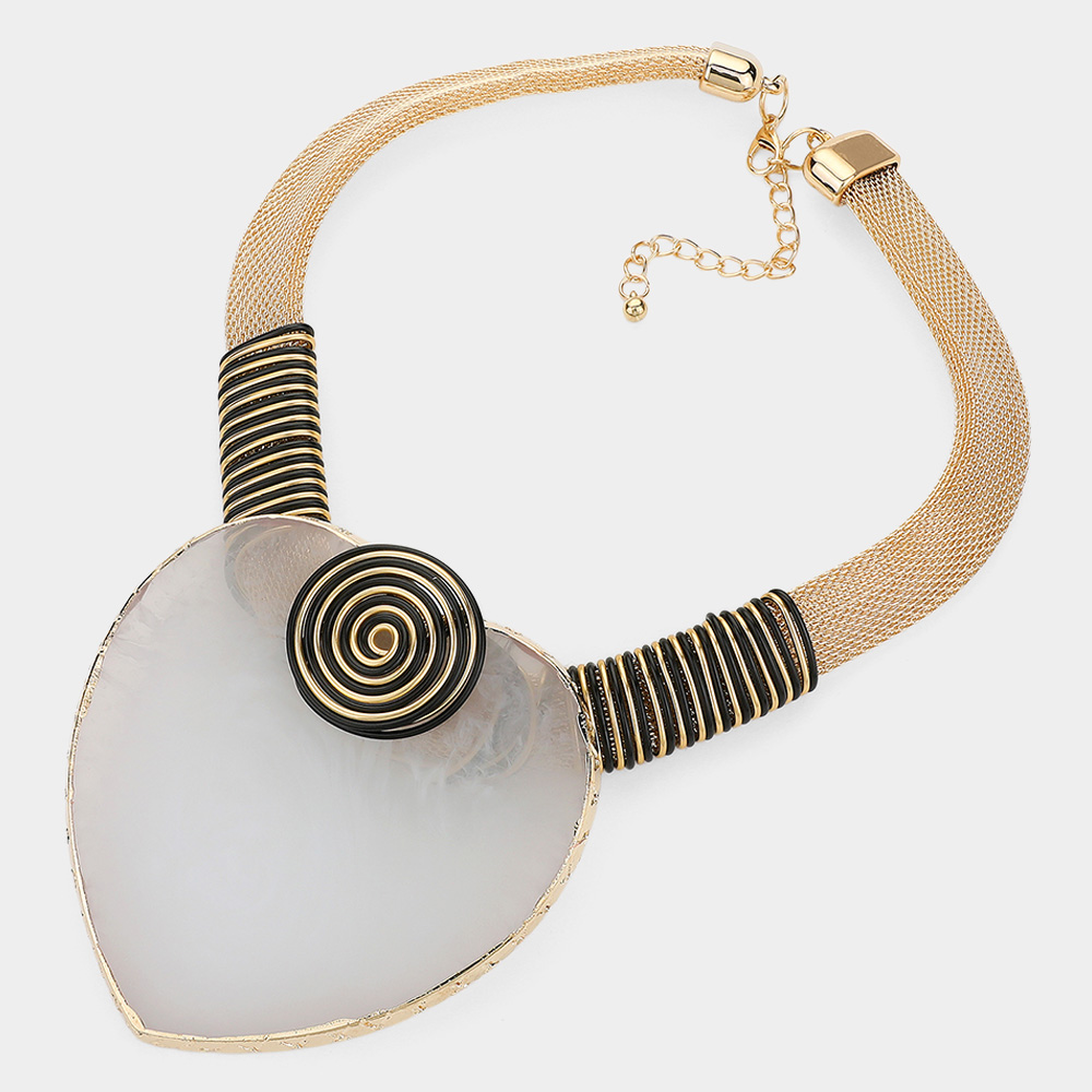 Oversized Marbled Resin Heart Pendant Accented Metal Wired Statement Necklace