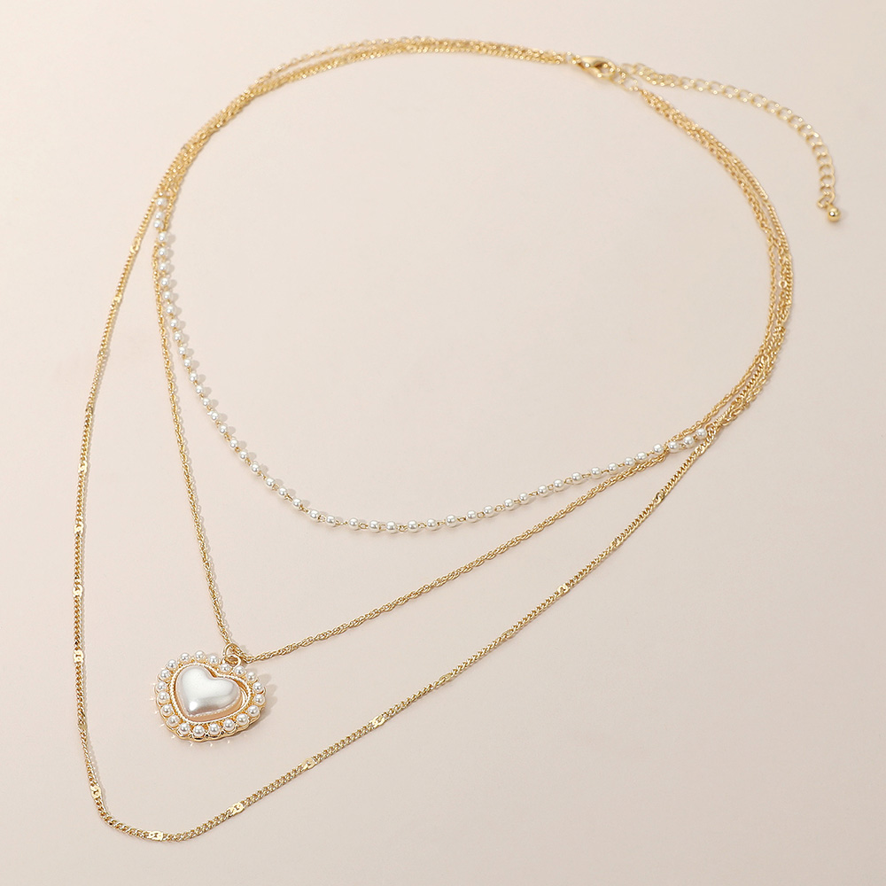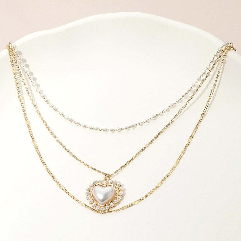 Pearl Heart Pendant Accent Triple Chain Layered Necklace