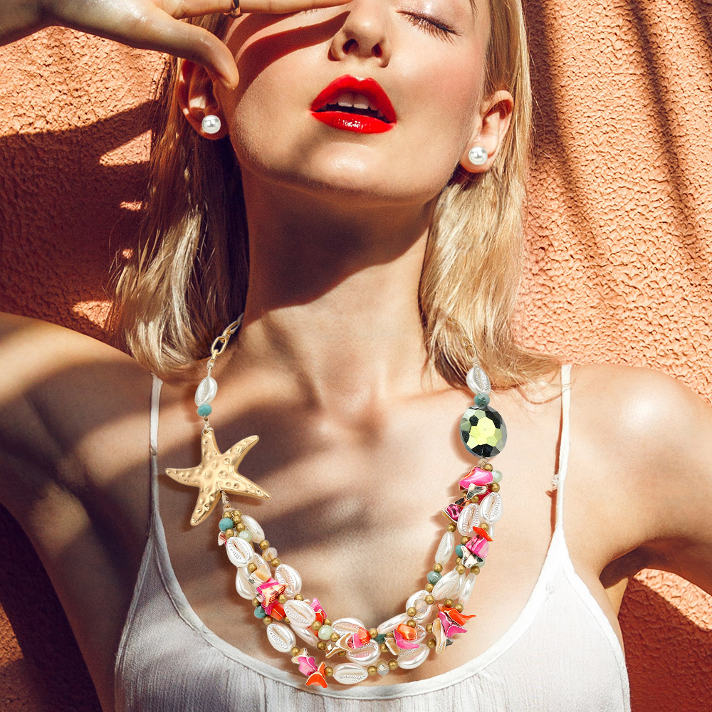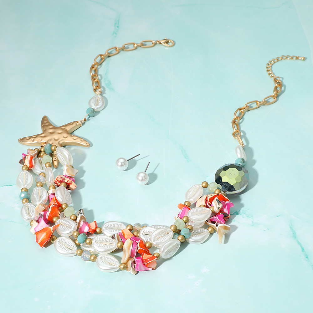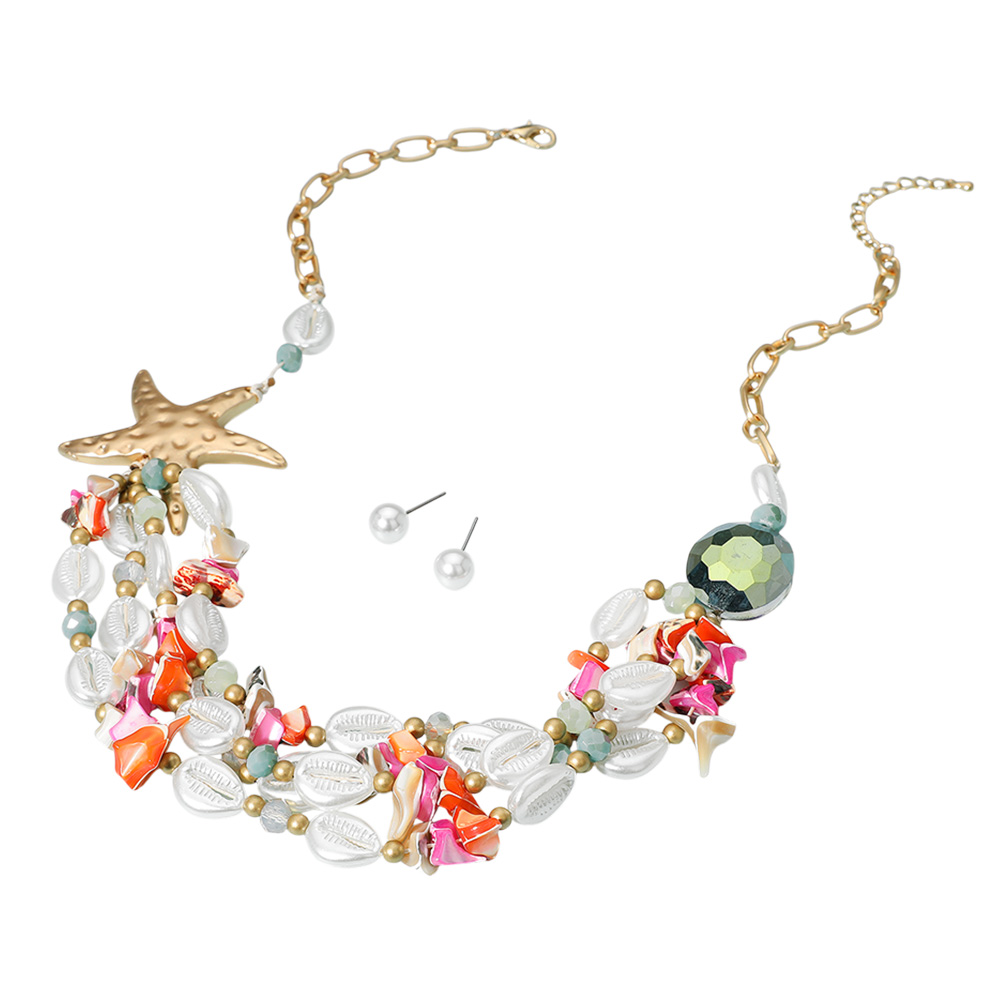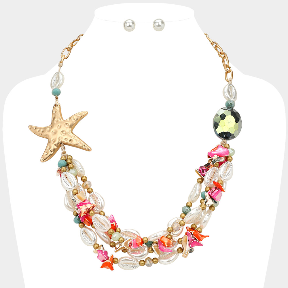 Pearl Puka Shell Stone Brushed Metal Starfish Beaded Layered Statement Necklace