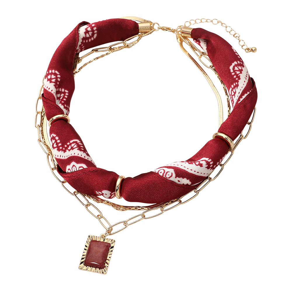 Rectangular Stone Pendant Accent Layered Fabric Scarf Necklace