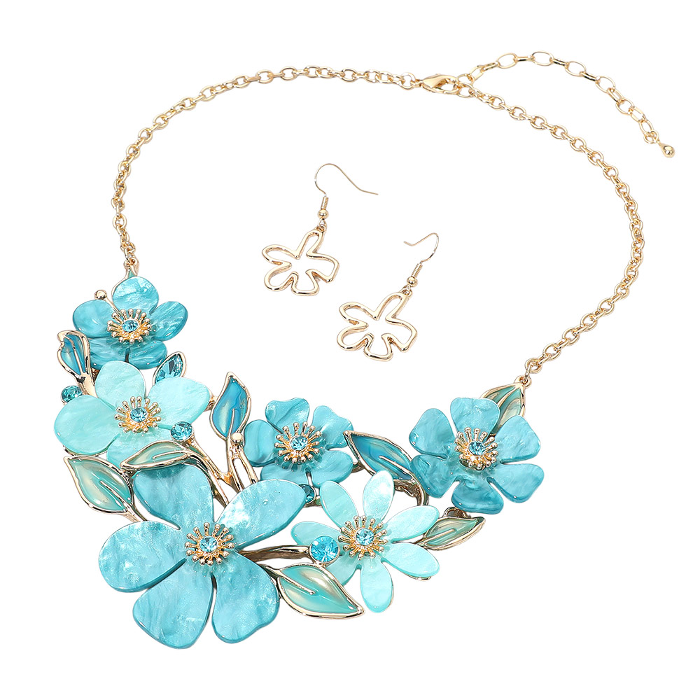 • This floral statement necklace and earring set showcases beautifully layered petals and delicate leaf accents, creating a bold yet elegant look. Perfect for special occasions or evening events, this coordinated set adds a sophisticated, feminine charm that enhances any ensemble.
