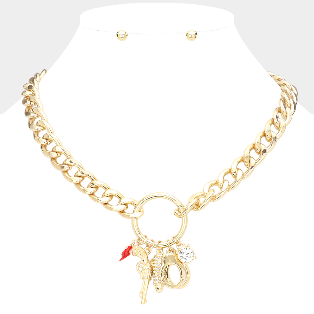 Rhinestone Bullet Metal Gun Handcuffs Enamel Lightning Pendant Necklace