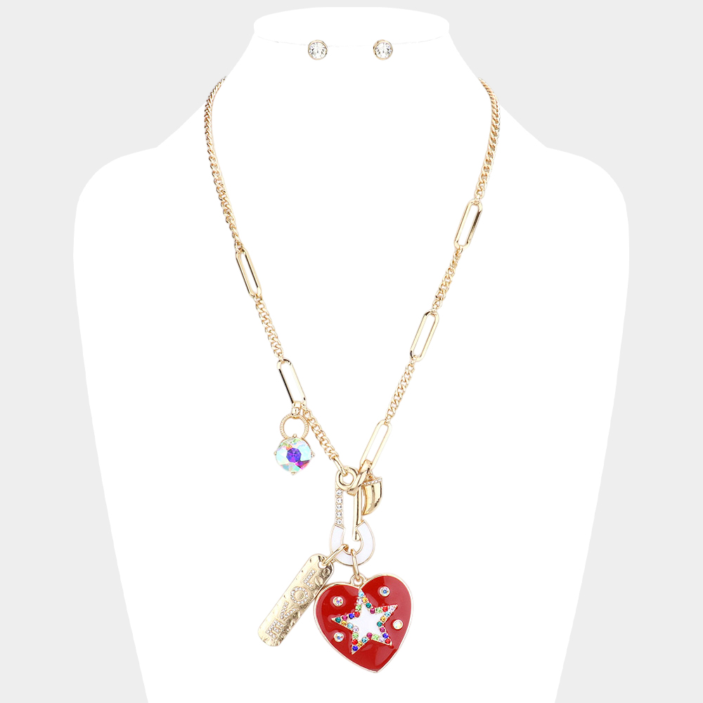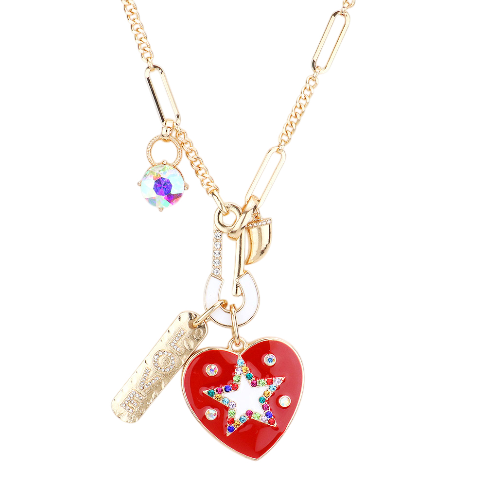 Rhinestone Embellished Safety Pin LOVE Star Centered Enamel Heart Pendant Necklace