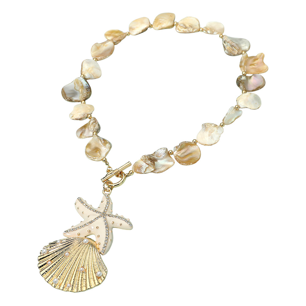 Details • Necklace Size : 18" + 3" L • Decor Size : 3.5" L • Embrace seaside elegance with this shell bead necklace featuring a bold starfish and seashell pendant accented with delicate details. Perfect for summer outfits, tropical vacations, or beach-inspired events, this statement necklace brings coastal charm and ocean-inspired style to your jewelry collection. • Lead and Nickel Compliant