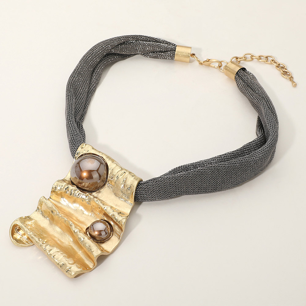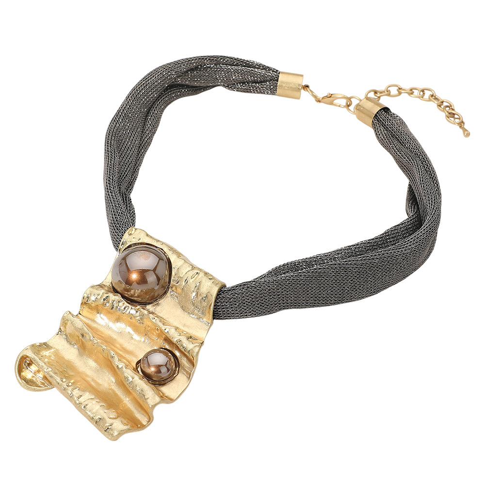 Details • Necklace Size : 17.75" + 3.25" L • Pendant Size : 2.25" X 3.25" • This statement necklace features layered mesh strands paired with an abstract sculpted pendant design for a bold, modern look. Created to stand out, it adds artistic dimension and elevated style to outfits ranging from casual to dressy. Ideal for boutiques seeking eye-catching, fashion-forward jewelry with strong visual impact. • Lead and Nickel Compliant