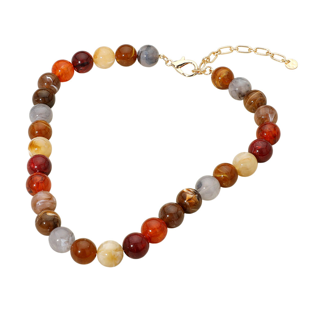 Details • Necklace Size : 17" + 3" L • Decor Size : 0.5" L • Add a touch of earthy elegance with this 17.5" round beaded necklace. Featuring polished natural stones in a variety of tones, each bead showcases unique patterns and depth. Finished with a secure clasp and extender, this versatile piece is perfect for layering or wearing solo. • Lead and Nickel Compliant