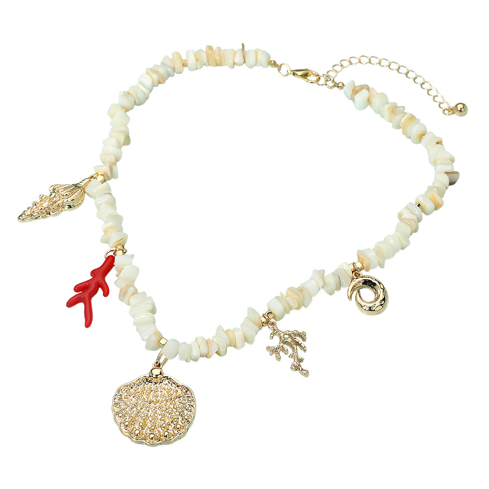 Details • Necklace Size : 17.5" + 3" L • Decor Size : 1.75" L • Add seaside elegance with this beaded charm necklace featuring shell-like beads and multiple pendants, including seashell, coral branch, and wave designs. Perfect for summer outfits, beach vacations, or festival wear, this necklace brings coastal-inspired style and playful charm to your look. • Lead and Nickel Compliant