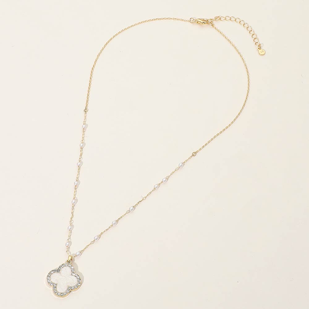 Details • Necklace Size : 16.5" + 2" • Pendant Size : 0.7" X 0.75" • Elegant station necklace featuring a quatrefoil-shaped charm accented with sparkling crystal details and spaced bead stations along a delicate chain. Designed with an adjustable length for versatile styling, this necklace adds a refined decorative touch to everyday outfits, gifting collections, or boutique jewelry displays. • Gold Dipped