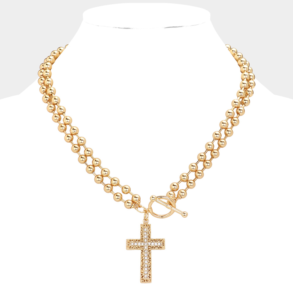 SECRET BOX_Stone Pointed Cross Pendant Bubble Chain Toggle Necklace