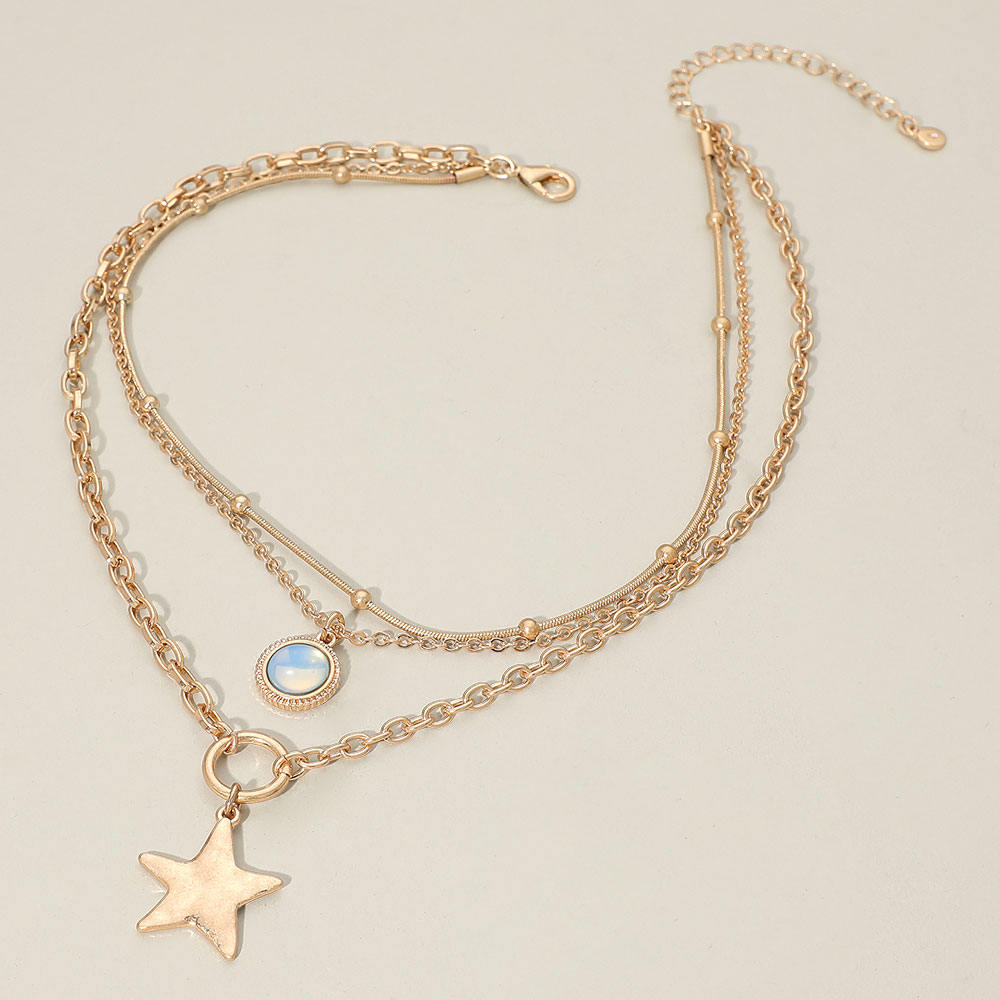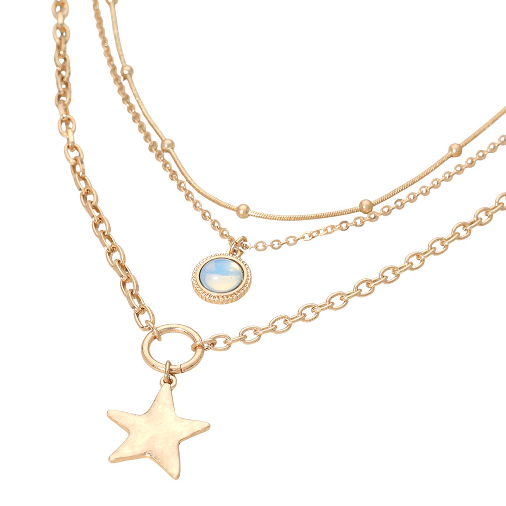 Details • Necklace Size : 14.5" + 3.5" L • Decor Size : 3.4" L • Elevate everyday looks with the Layered Star Charm Necklace, featuring multiple delicate chains accented with a star charm and a luminous round detail for eye-catching dimension. Perfect for solo styling or pairing with other favorites for a chic, layered statement. • Lead and Nickel Compliant