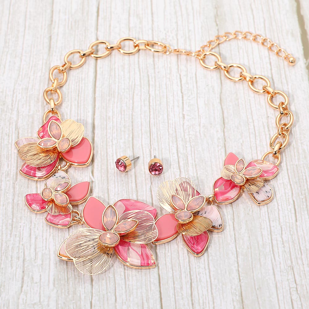 • Elegant floral statement necklace paired with matching stud earrings for a coordinated and eye-catching look. Designed with layered petal details, this accessory set adds a touch of sophistication and charm, making it ideal for special occasions or standout styling.