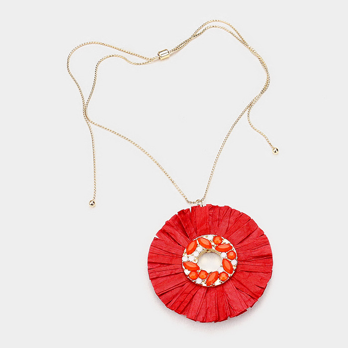 Stone Embellished Raffia Fringe Circle Pendant Necklace