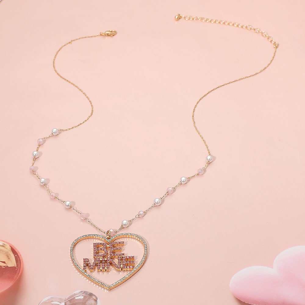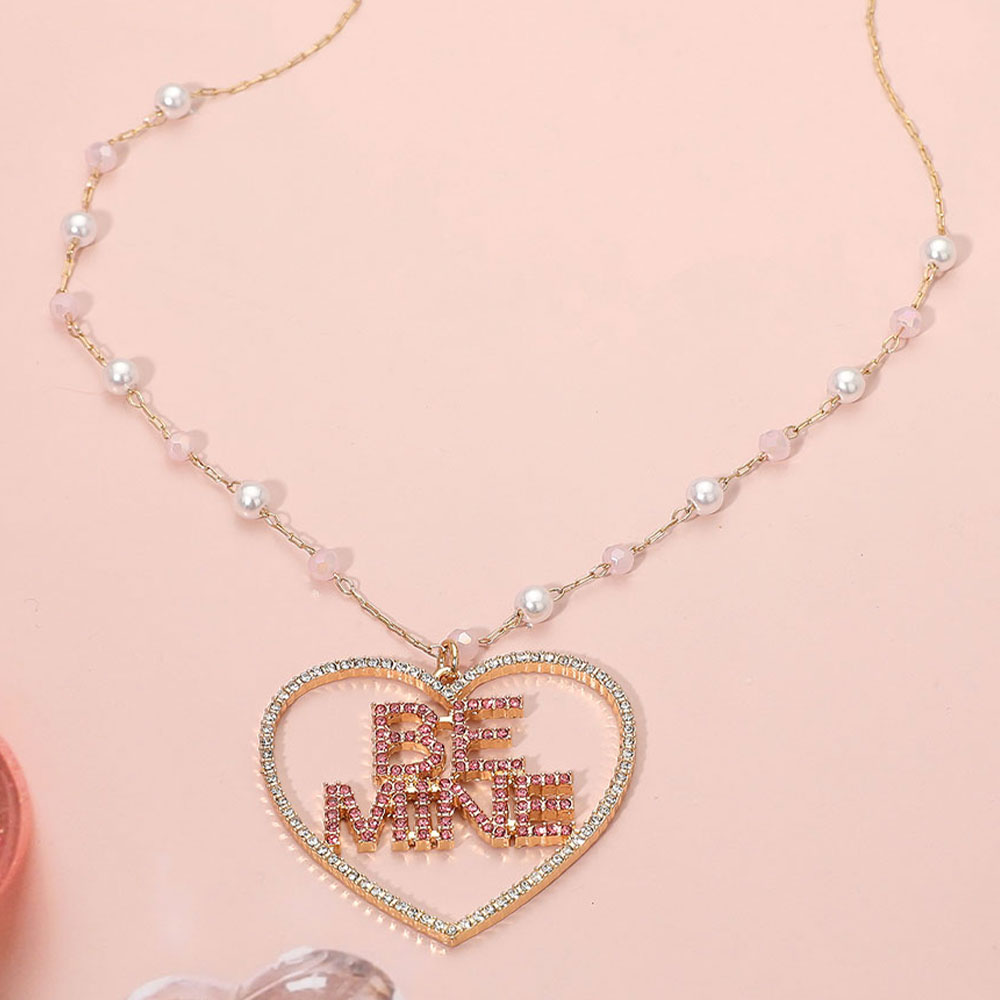 Stone Paved BE MINE Heart Pendant Pearl Bead Station Chain Necklace