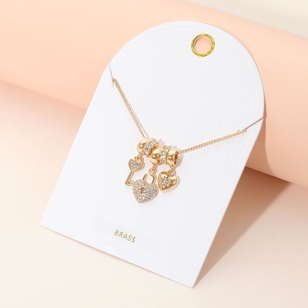 Details • Necklace Size : 16" + 3.25" L • Decor Size : 1" L • Chic necklace adorned with sparkling heart-shaped charms, including a lock and key design. Set on a fine chain, this piece brings a romantic and stylish flair to any outfit. Ideal for daily wear or gifting, it adds charm and sentiment to your jewelry collection. • Lead and Nickel Compliant • Brass
