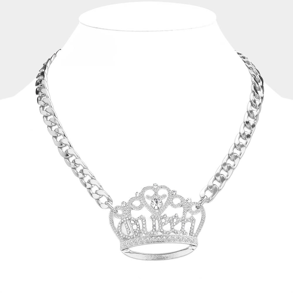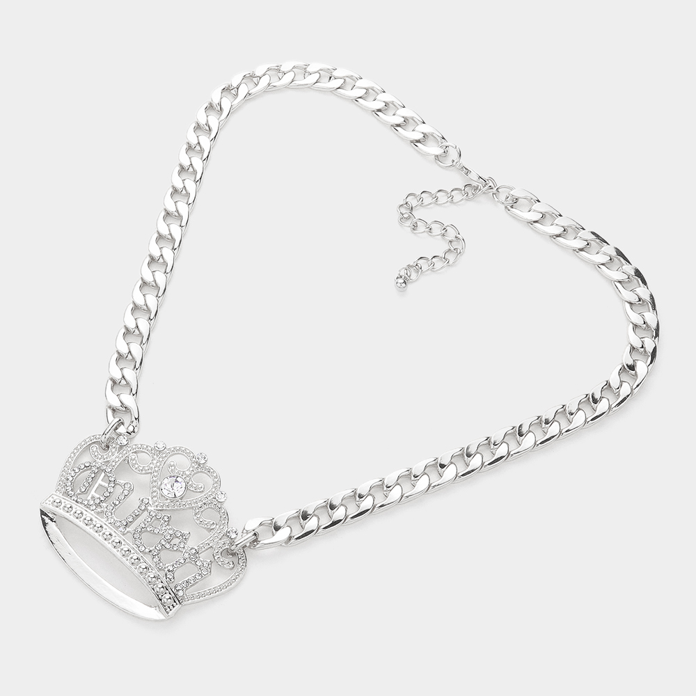 Stone Paved QUEEN Message Accented Crown Pendant Chunky Chain Necklace