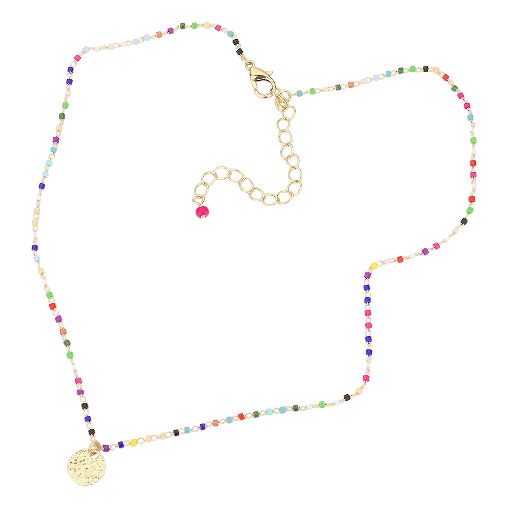 Textured Metal Disc Pendant Tiny Bead Link Necklace
