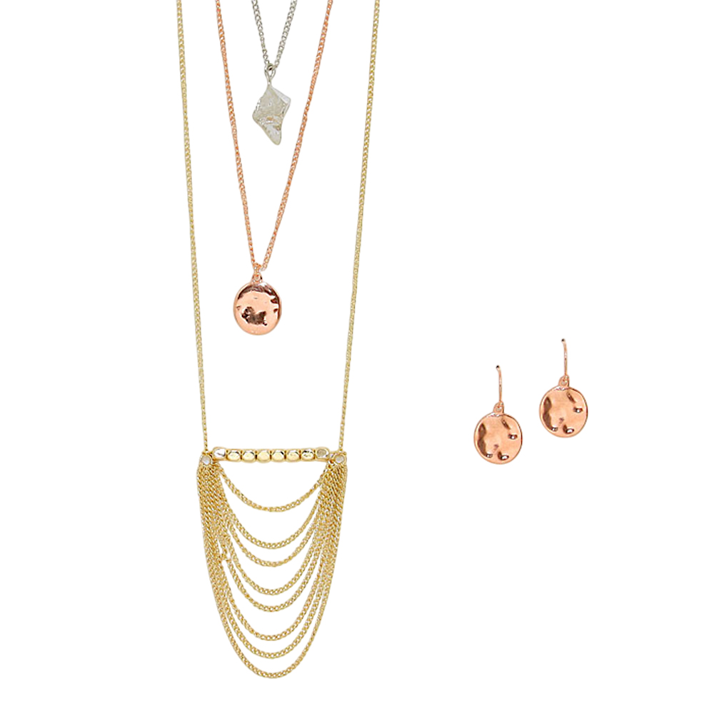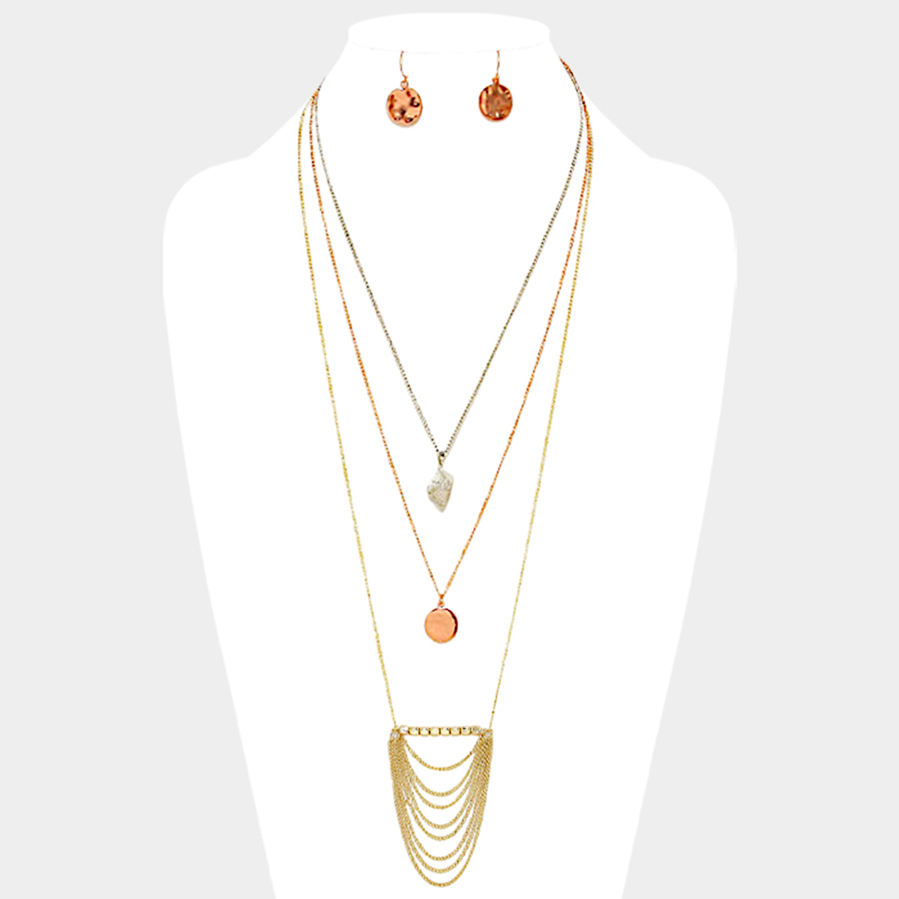 Triple Layer Hammered Metal Disc & Draped Chain Pendant Necklace