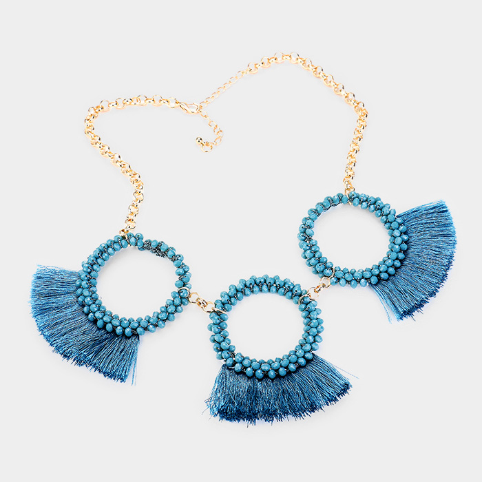 Wood Open Circle Raffia Tassel Dangle Earrings