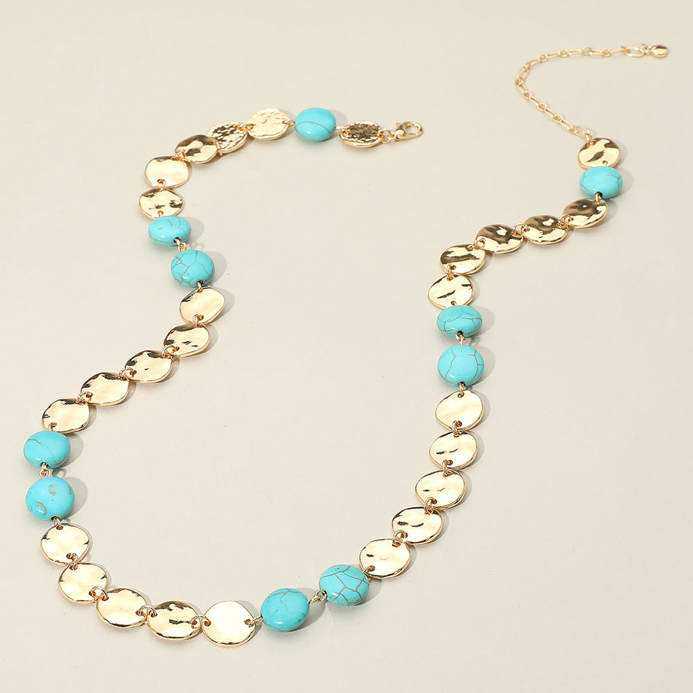 Turquoise Stone Hammered Metal Disc Link Necklace