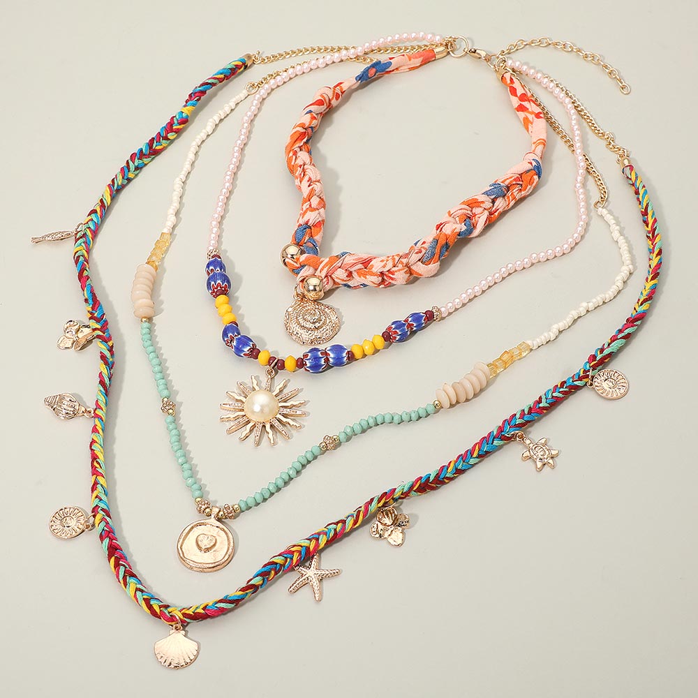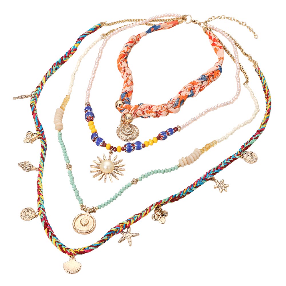 Details • Necklace Size : 16" + 3" L • Decor Size : 11" L • Stylish multi-layered necklace set featuring braided cords, beaded strands, and assorted charms including sun, seashell, coin, and more. A statement layered accessory that adds playful detail and standout appeal to any outfit. Perfect for everyday wear or vacation looks. • Lead and Nickel Compliant