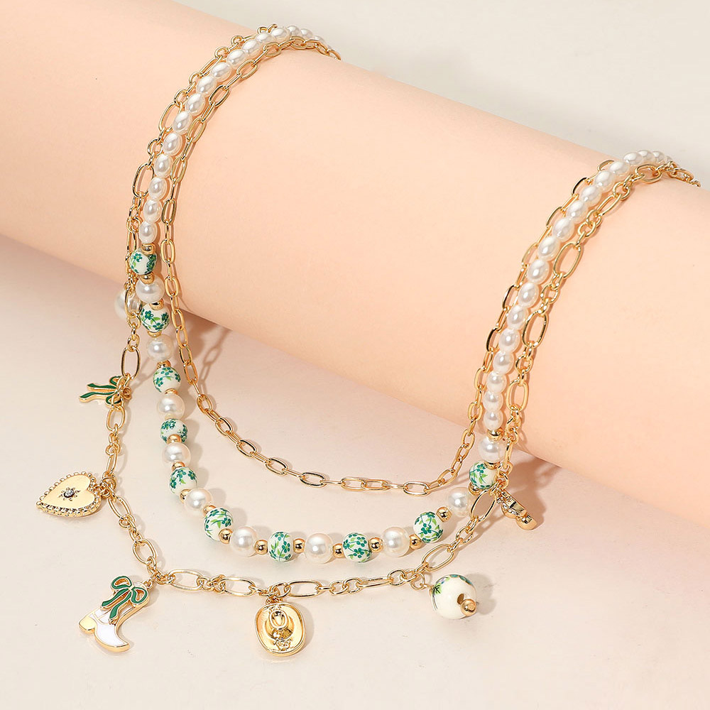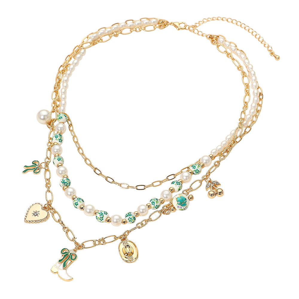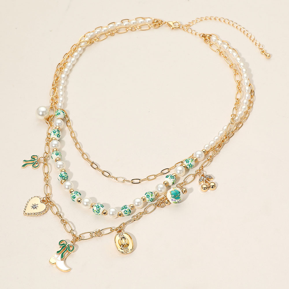 Western Cowboy Boot Hat Bow Cherry Heart Charm Station Pearl Floral Ceramic Ball Beaded Layered Necklace