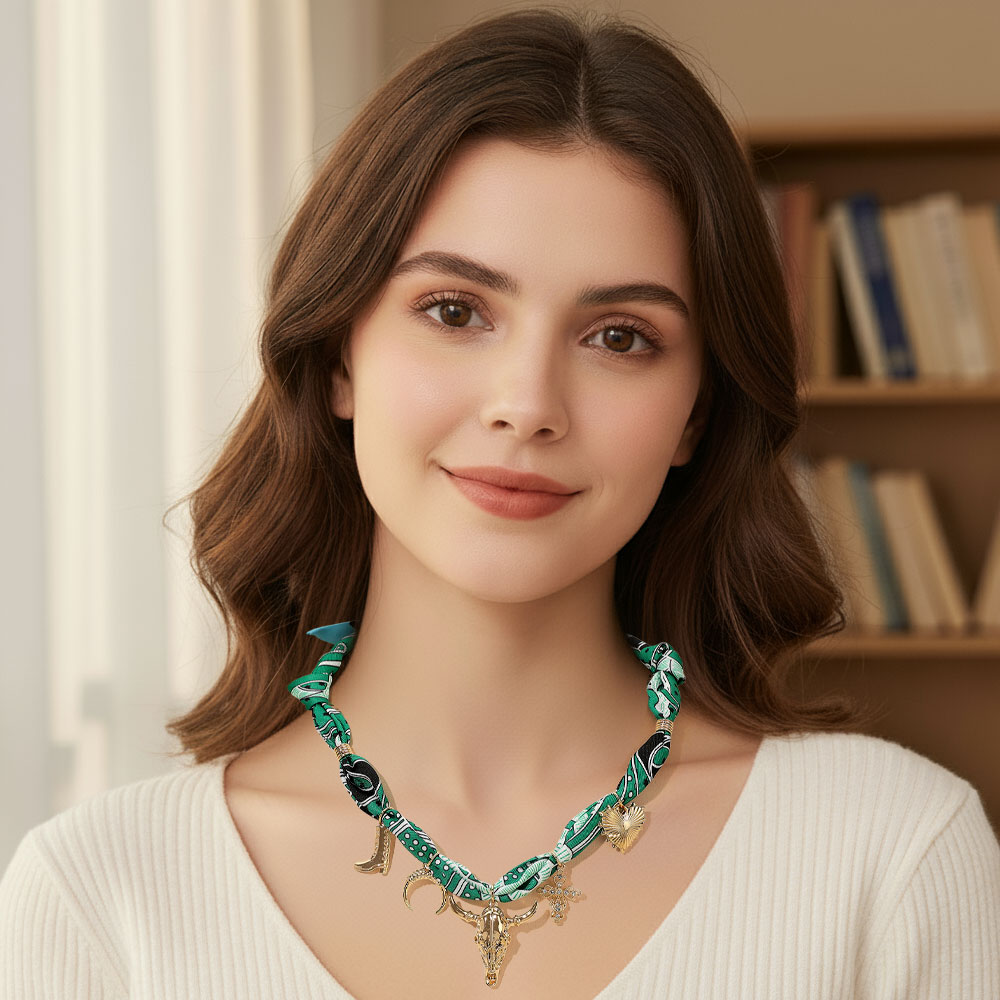• Make a stylish statement with this scarf necklace featuring Western-inspired charms. Accented with symbolic details like a bull head, crescent, and heart, this versatile accessory blends chic design with rustic flair, perfect for adding personality to any outfit.