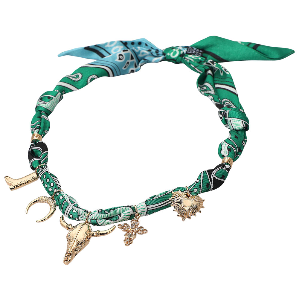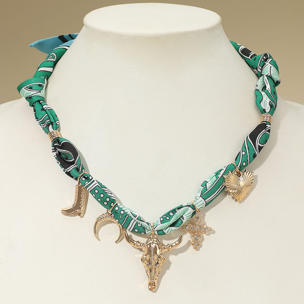 Western Steer Head Cowboy Boot Horseshoe Cross Heart Charm Station Fabric Bandana Scarf Necklace