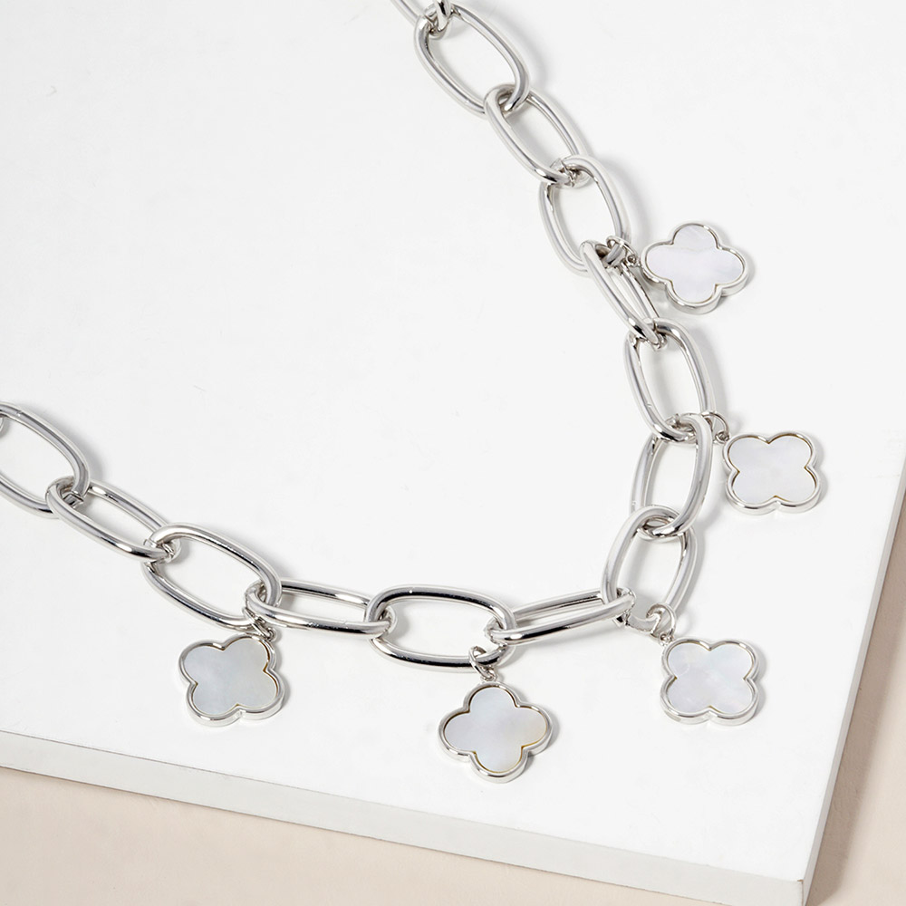 White Gold Dipped Mother Of Pearl Quatrefoil Charm Station Chunky Chain Necklace