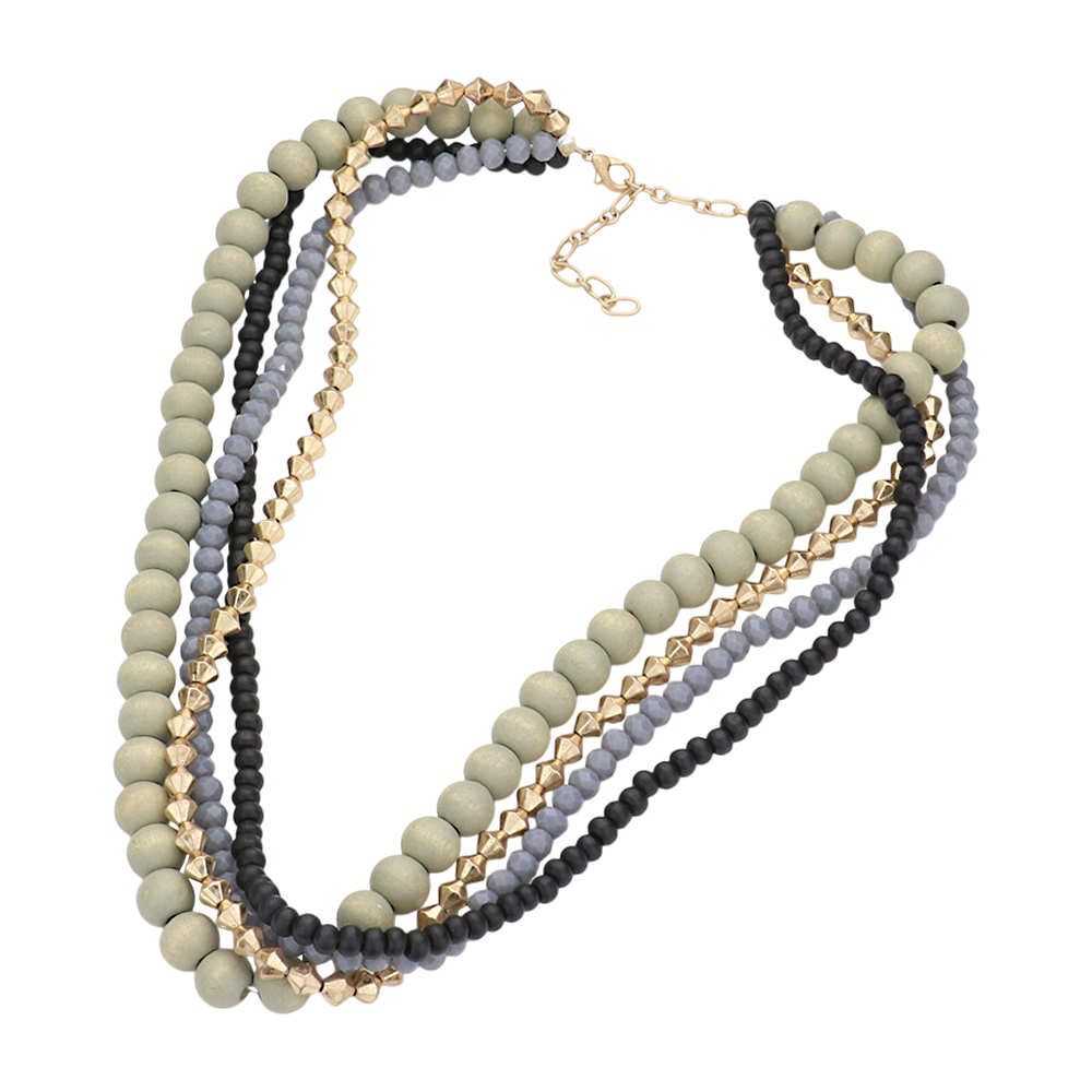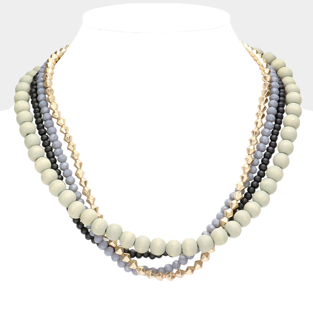 Wood Ball Seed Beaded Triple Layered Bib Necklace