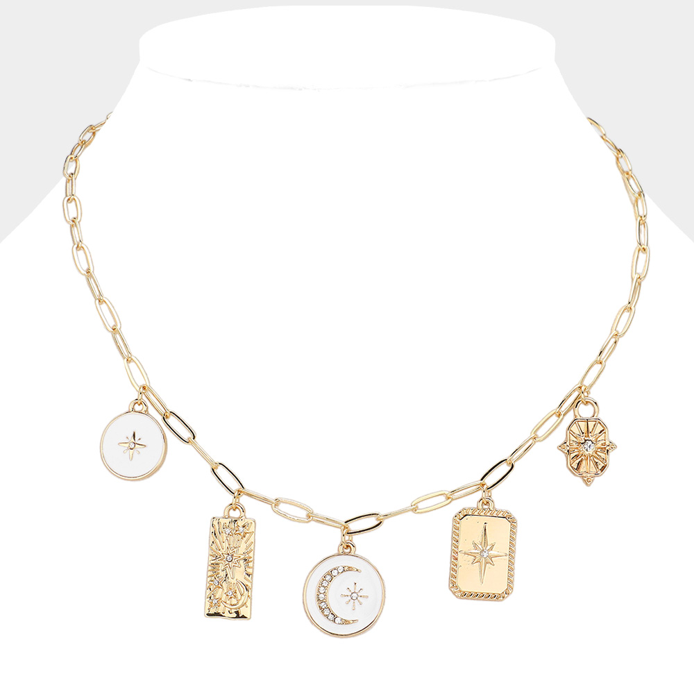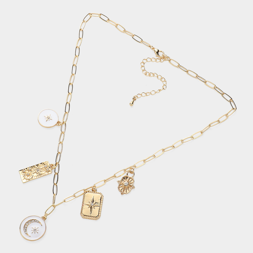 Stone Paved Moon and Star Evil Eye Celestial Charm Pendant Necklace