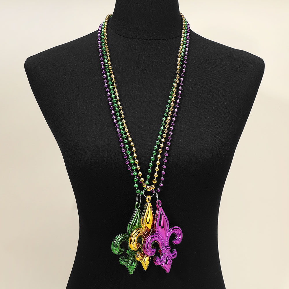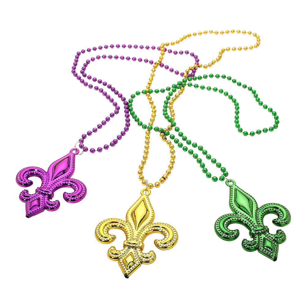 Details • Necklace Size : 32" L • Pendant Size : 3" X 4.25" • Fleur-de-lis pendant necklace set designed with a bold emblem charm and classic beaded chain for statement appeal. Ideal for celebrations, themed events, parades, and party styling, these necklaces add iconic flair and playful character to outfits while remaining lightweight and easy to wear. • Lead and Nickel Compliant