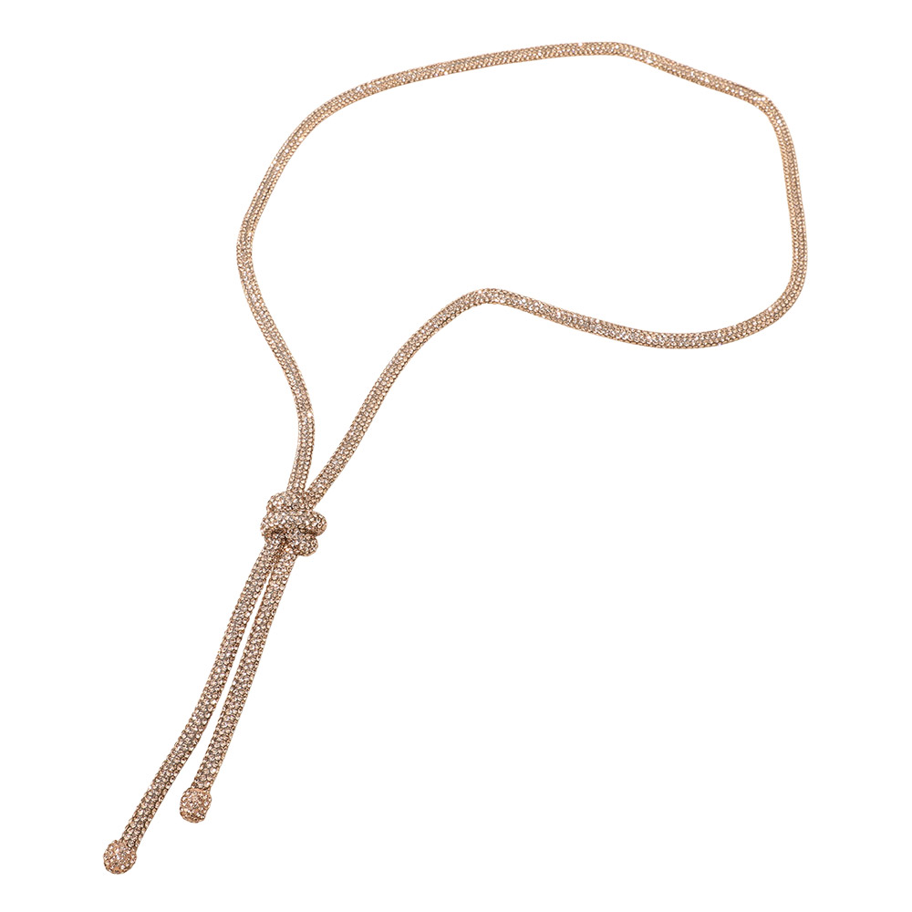 • This elegant bling studded lariat chain necklace features a sleek knotted design that drapes beautifully for a modern, sophisticated look. Perfect for both casual and formal settings, its adjustable length and minimalist charm make it a versatile addition to any jewelry collection.