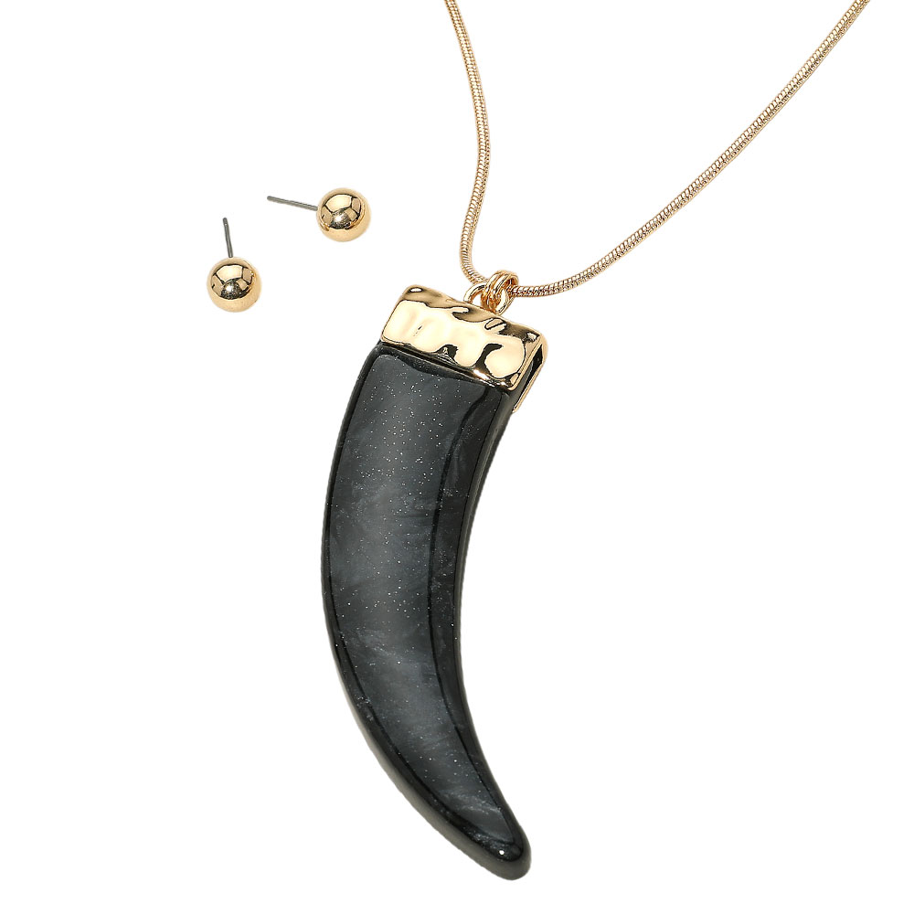 • Sleek necklace featuring a horn-shaped pendant paired with simple stud earrings. A minimalist set perfect for adding a bold accent to everyday or evening wear. Versatile and stylish design.