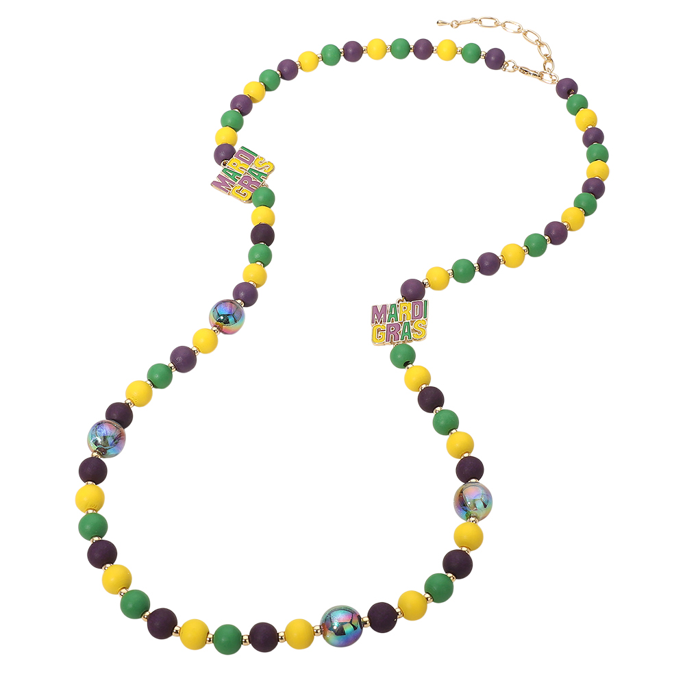 Details • Necklace Size : 34" + 3.25" L • Decor Size : 0.9" L • Statement Mardi Gras–inspired necklace designed with smooth round beads, luminous accent beads, and decorative charm details spaced throughout the strand. Finished with an adjustable chain for comfortable wear. Ideal for parade outfits, themed events, party styling, and festive boutique displays. A versatile accessory that adds playful character and celebration-ready appeal. • Lead and Nickel Compliant