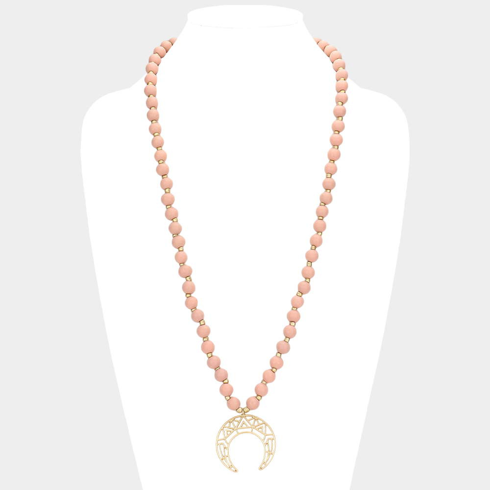 Metal Cutout Double Horn Pendant Wood Long Necklace