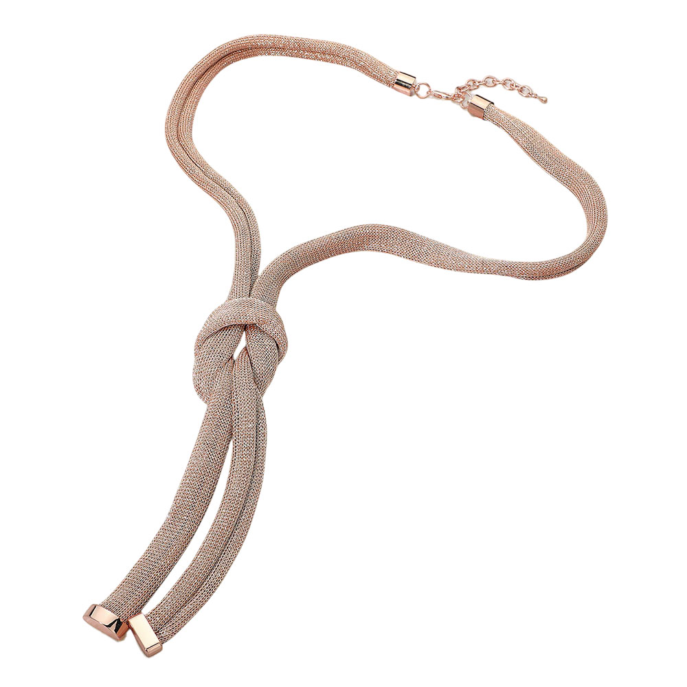 Details • Necklace Size : 33" + 3.25" L • Decor Size : 8" L • Sleek statement necklace featuring a soft, flexible silhouette with a sculptural knot detail for modern elegance. Designed to drape smoothly and add visual interest, this necklace enhances everyday outfits, workwear, and special occasions with refined, fashion-forward appeal. • Lead and Nickel Compliant