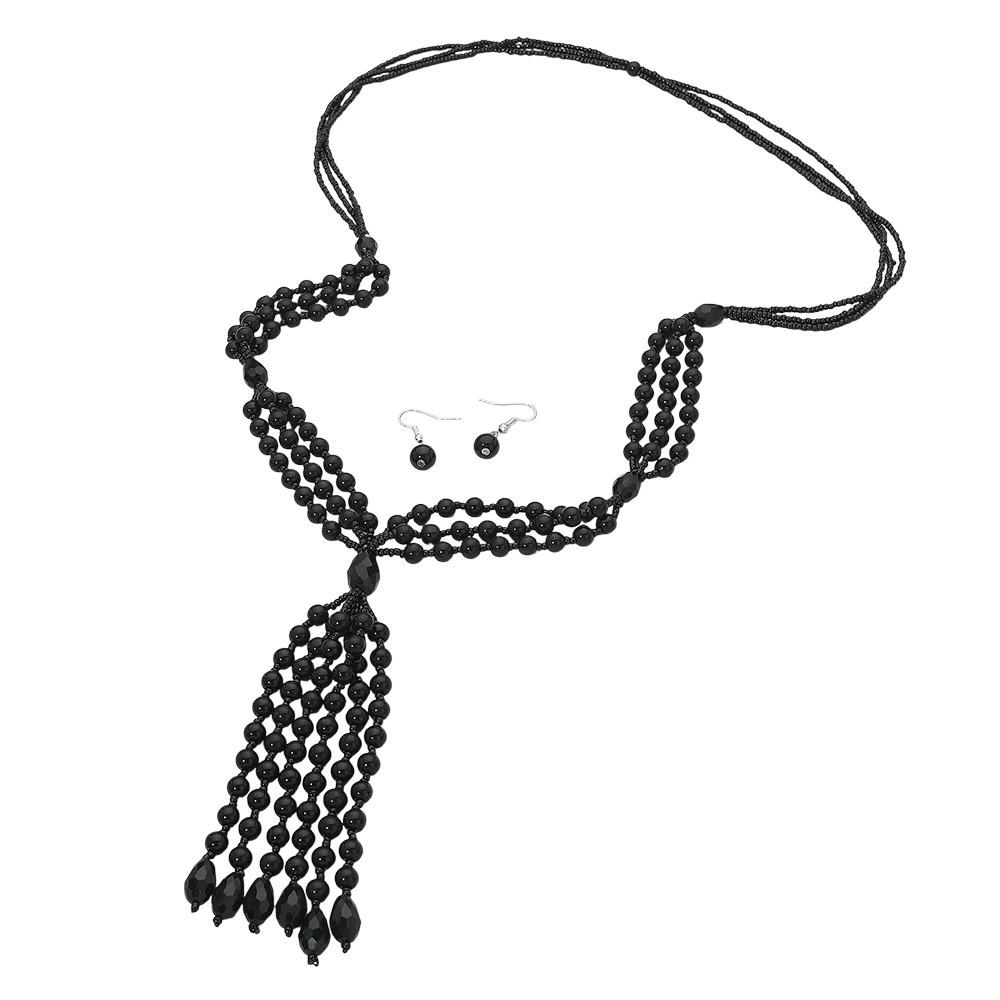 • This beaded necklace set features a layered strand design with an elegant tassel drop centerpiece and matching dangle earrings. Created to make a statement, it’s ideal for evening wear, special events, or elevated everyday styling. A bold yet versatile accessory set perfect for boutiques seeking dramatic silhouette, movement, and refined detail in curated jewelry collections.