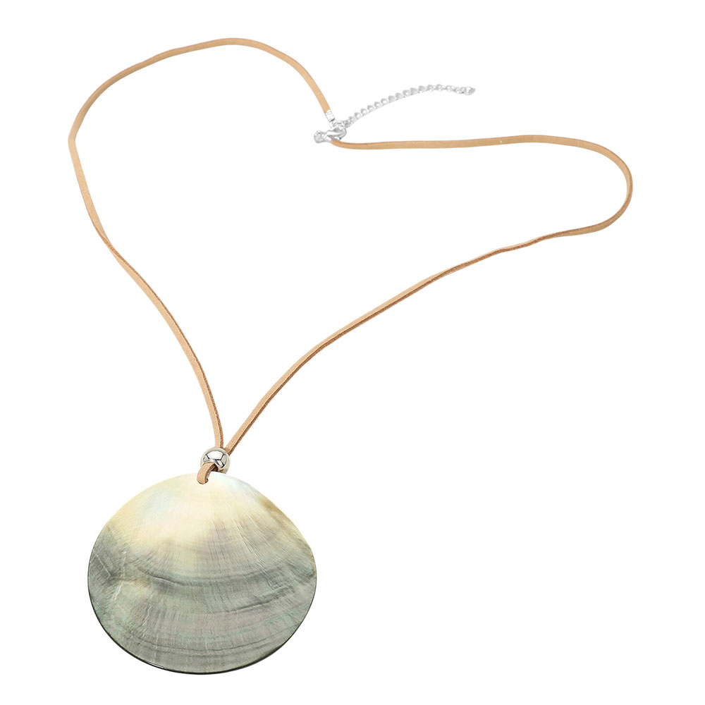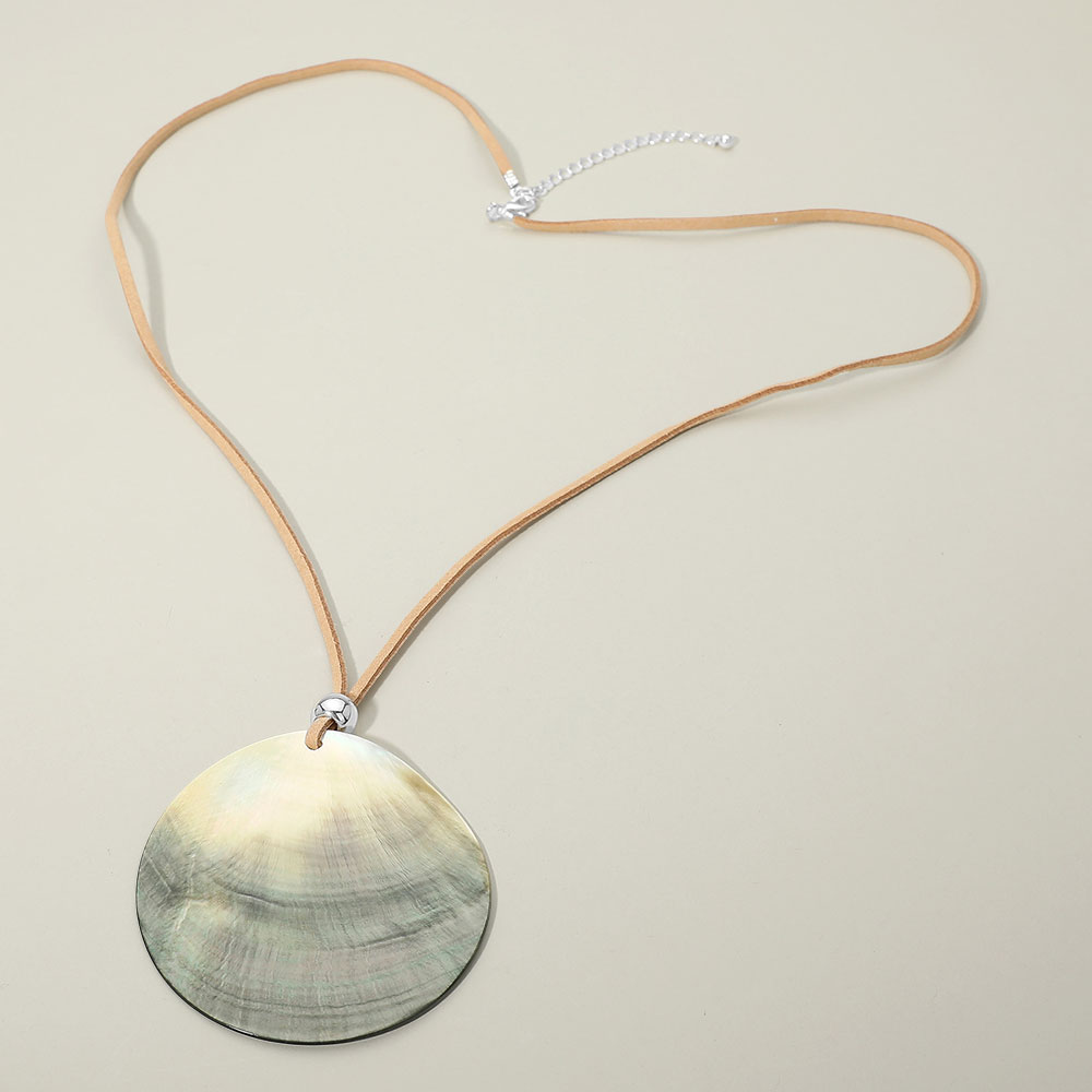 Details • Necklace Size : 30" + 3.25" L • Pendant Size : 2.75" X 3.25" • This long necklace features a smooth abalone round disc pendant with subtle natural texture and a clean, modern silhouette. Designed for effortless styling, it works beautifully as a standalone statement or layered with other pieces, making it a versatile choice for everyday wear and curated boutique collections. • Lead and Nickel Compliant