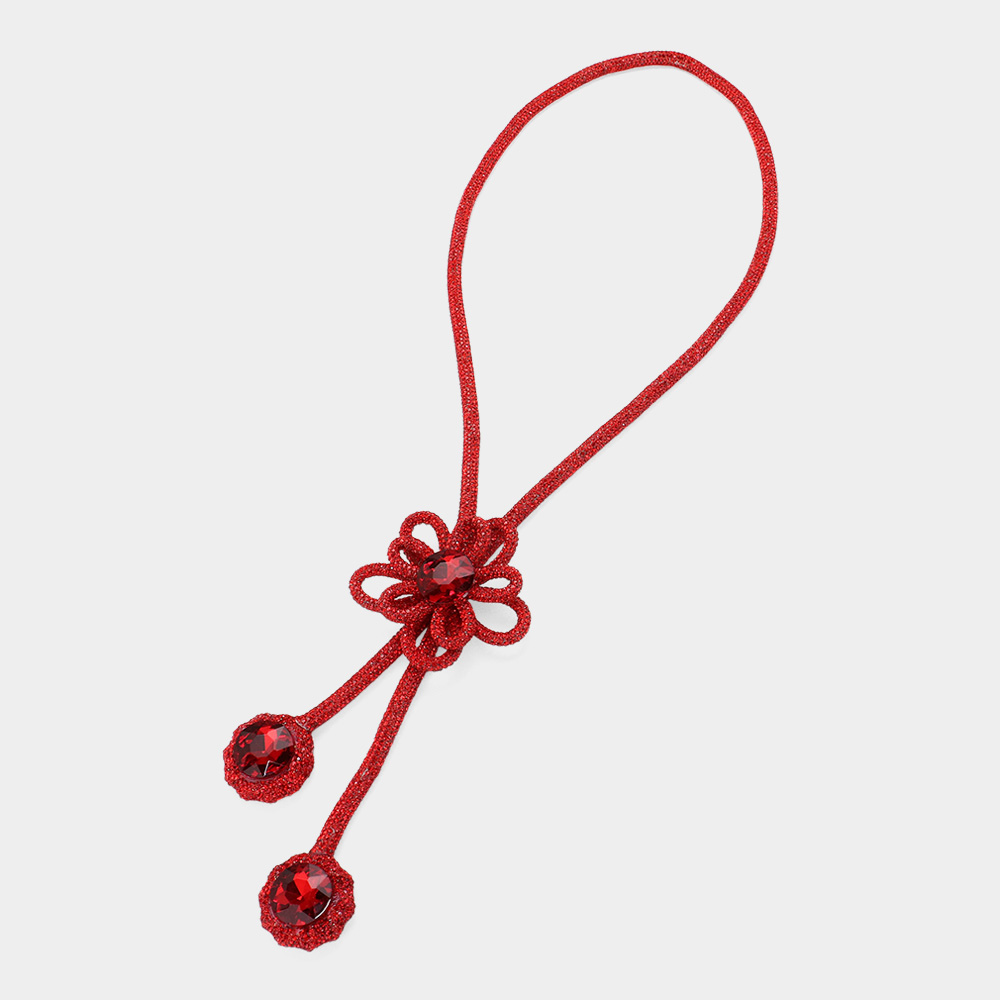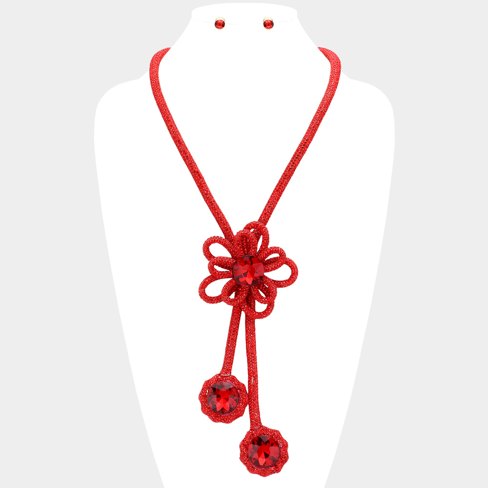 Round Stone Pointed Bling Studded Flower Pendant Long Necklace