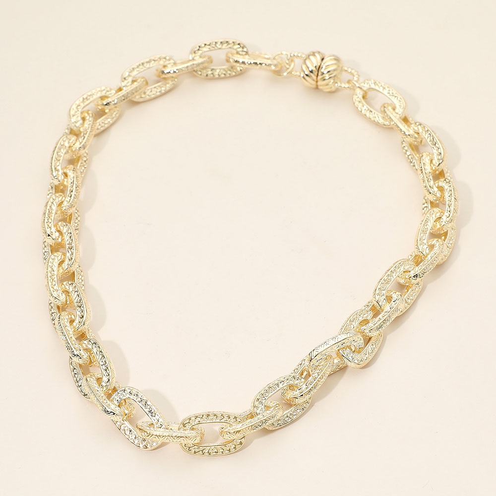 • This statement chain necklace features bold oval links with intricate textured detailing, creating a luxurious and modern look. Perfect for layering or wearing solo, it adds a touch of sophistication and confidence to any outfit, from everyday wear to elegant ensembles.