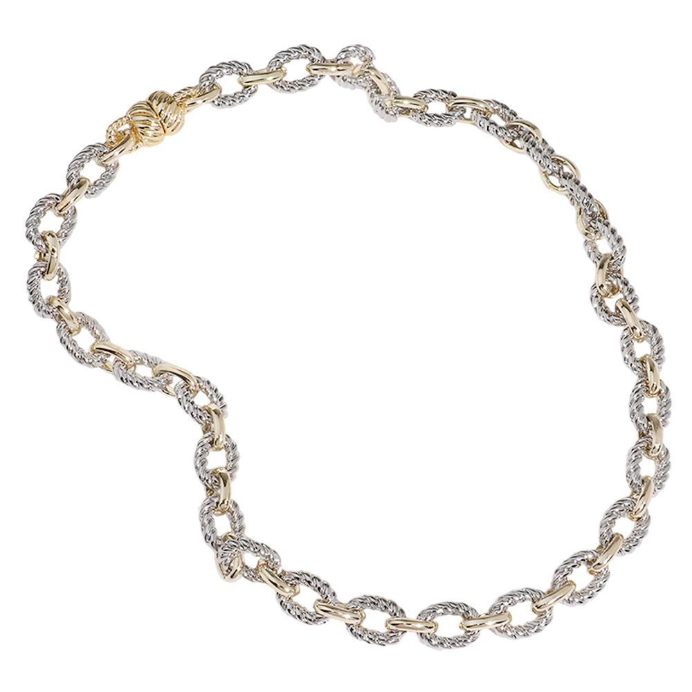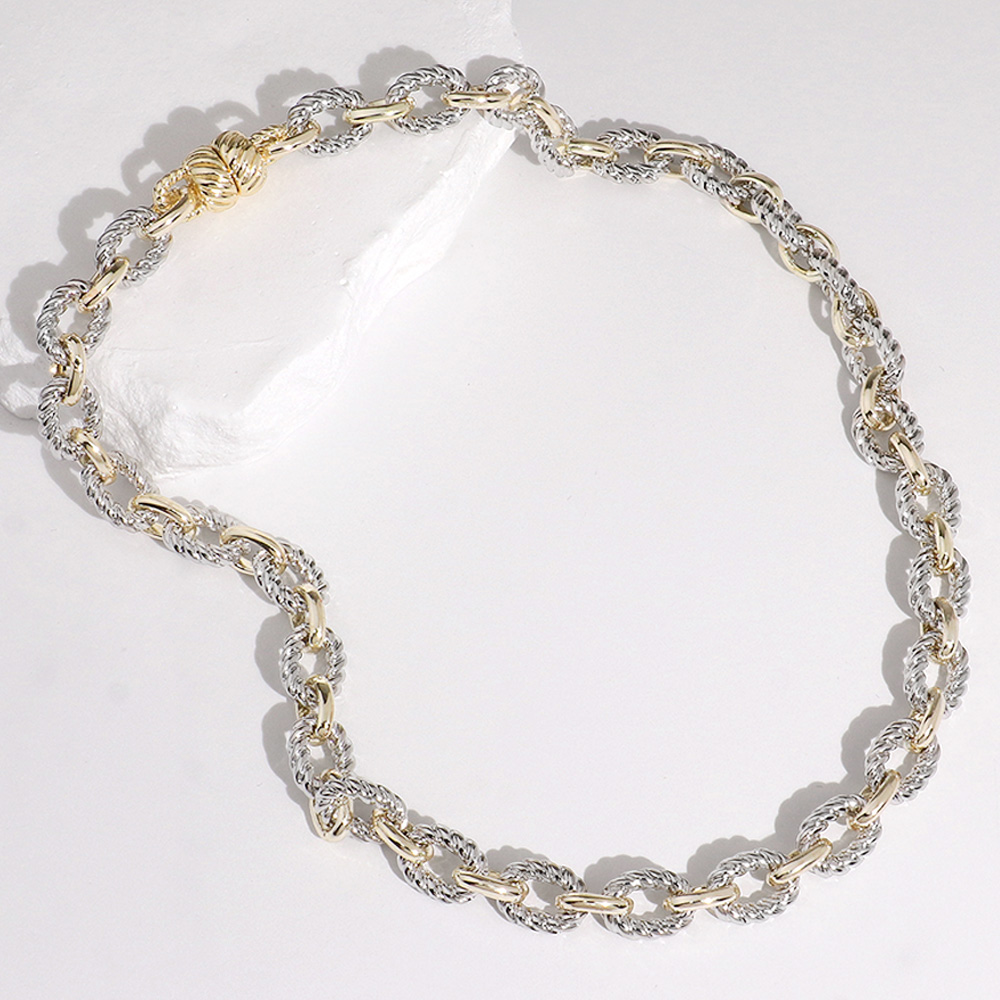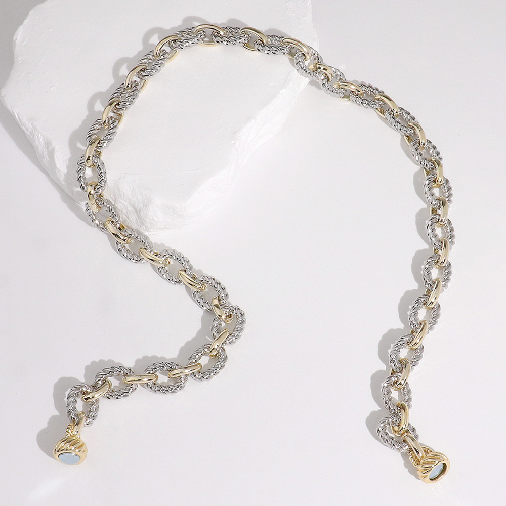 Details • Necklace Size : 16.75" L • Decor Size : 0.3" L • Magnetic Closure • Featuring alternating polished and textured links, this twist rope inspired chain necklace offers a refined, versatile look. Its intricate design adds depth and sophistication, making it perfect for elevating everyday outfits or enhancing evening ensembles with timeless charm. • Gold Dipped