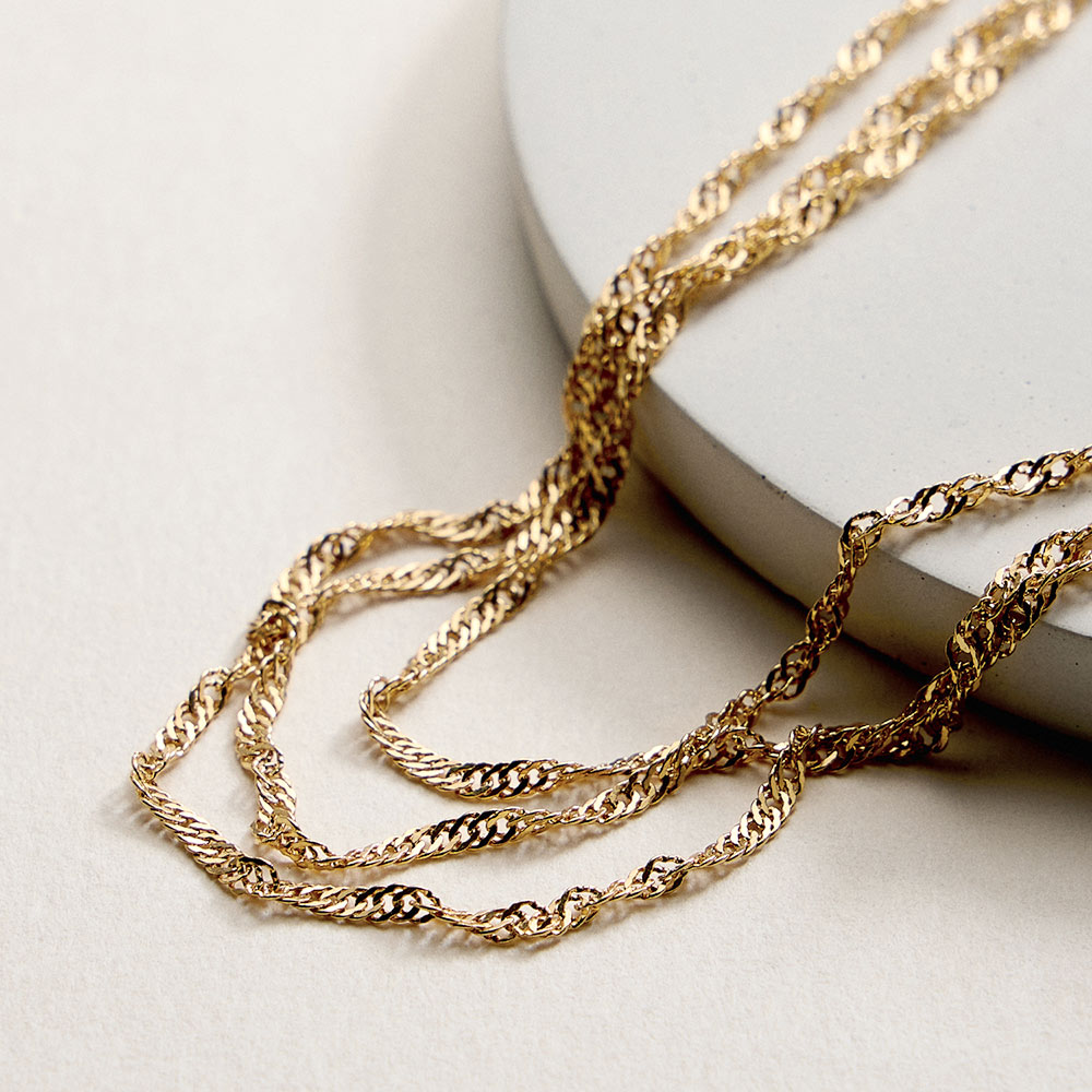 Details • Necklace Size : 17.5" + 1.5" L • Decor Size : 1" L • Elegant twisted chain necklace designed with a slim, lightweight silhouette for effortless daily wear. Ideal for layering with other necklaces or wearing alone for subtle shine. A versatile accessory that complements casual outfits, work looks, and minimalist jewelry styling. • Gold Filled • Hypoallergenic • Lead and Nickel Compliant • Made In Brazil